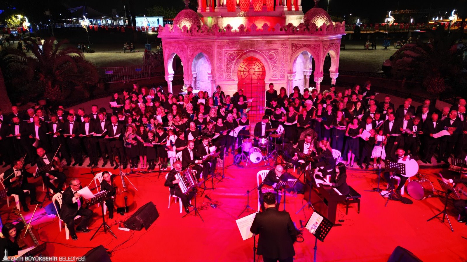 Klasik Türk Müziği Korosu, Yarımada Türk Müziği Korosu, ESHOT Türk Müziği Korosu ve İtfaiye Türk Müziği Korosu’ndan oluşan İzmir Büyükşehir Belediyesi korolarının bulunduğu 100. Yıl Cumhuriyet Özel Korosu, izleyenlere unutulmaz anlar yaşattı. İnanç Menekşe şefliğinde sahneye çıkan koronun konuğu da Milli Bayramlar Komitesi Başkanı Ulvi Puğ oldu.