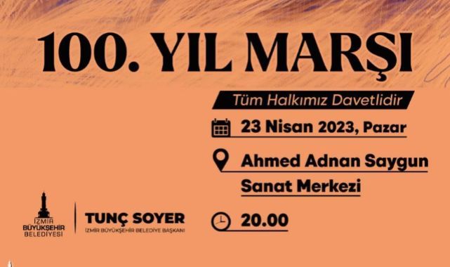 İzmir Büyükşehir Belediyesi, Cumhuriyet’in kuruluşunun 100. yılı anısına Türk halkına unutulmaz bir armağan sunuyor. Bestesini dünyaca ünlü piyanist Fazıl Say’ın yaptığı 100. Yıl Marşı 23 Nisan Ulusal Egemenlik ve Çocuk Bayramı’nda ilk kez Türkiye ile buluşacak. Ahmed Adnan Saygun Sanat Merkezi’nde 23 Nisan Ulusal Egemenlik ve Çocuk Bayramı’nda seslendirilecek eseri tüm İzmirliler saat 20.00’da ücretsiz olarak AASSM’de dinleyebilecek. Ayrıca salonun dışında da led ekran kurulacak. 100. Yıl Marşı aynı zamanda Halk TV'den, İzmirTube ile İzmir Büyükşehir Belediyesi’nin sosyal medya hesaplarında da yayınlanacak.