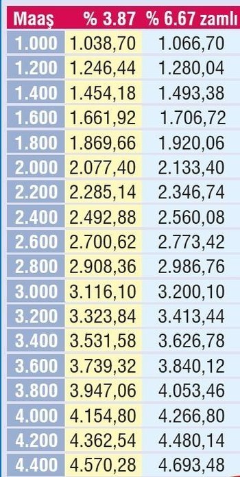 Bu tahmine göre, SSK ve Bağ- Kur emeklilerinin maaşında 68,12 ile 326,31 lira arasında artış yaşanacak. En düşük emekli aylığı bin 89 lira 51 kuruşa, en yüksek maaş da 5 bin 218 lira 50 kuruşa yükselecek.