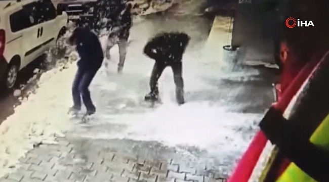 apartmanın çatısında biriken kar kütlesi üzerlerine doğru düştü. Kar kütlesini