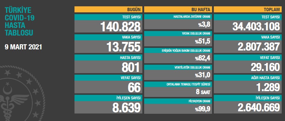 Ağır hasta sayısı 1289 oldu, 8 bin 639 kişinin Kovid-19 tedavisinin/karantinasının sona ermesiyle iyileşen sayısı 2 milyon 640 bin 669'a yükseldi.