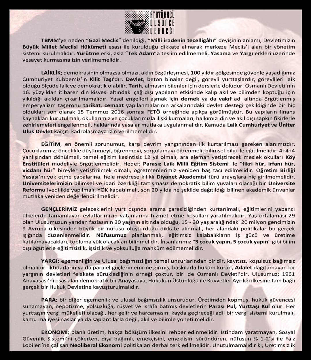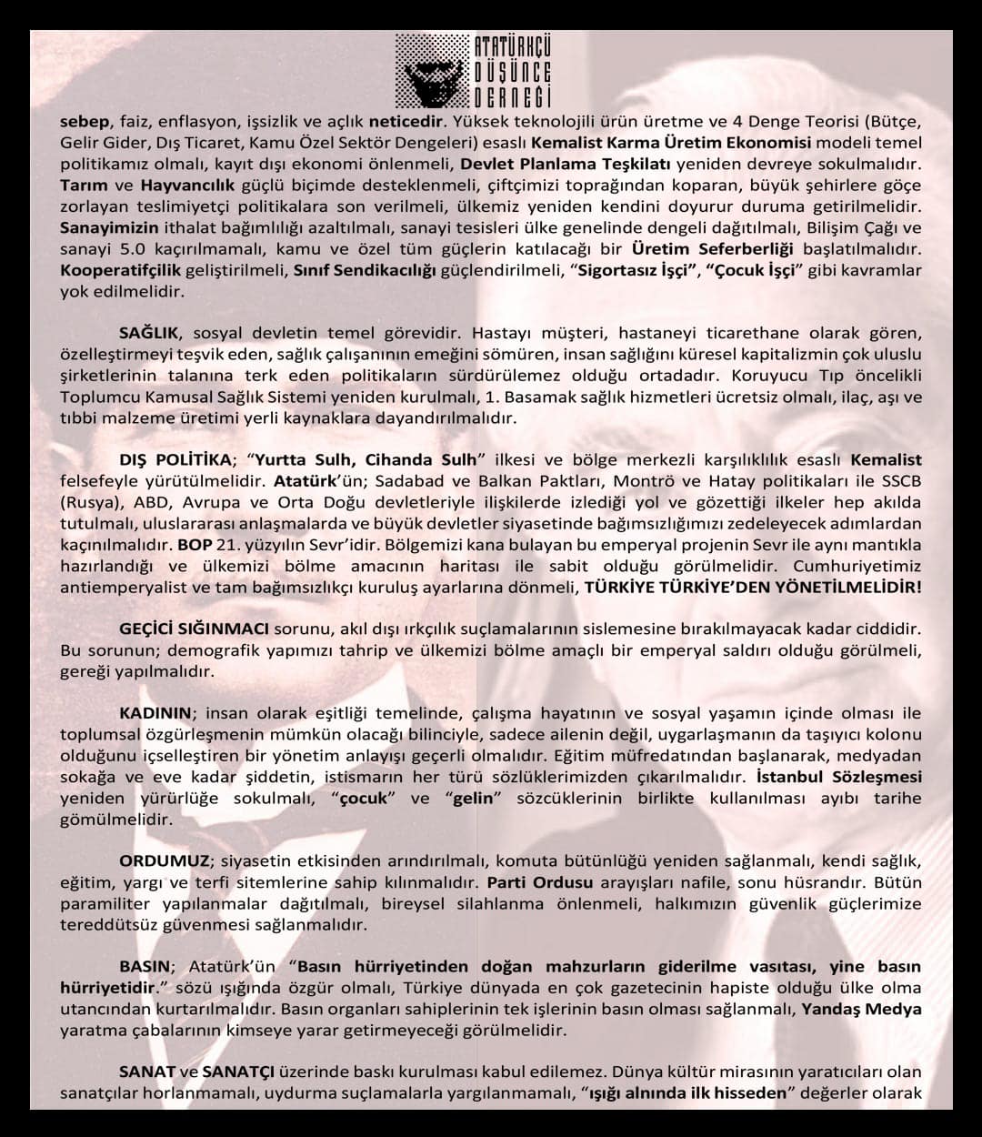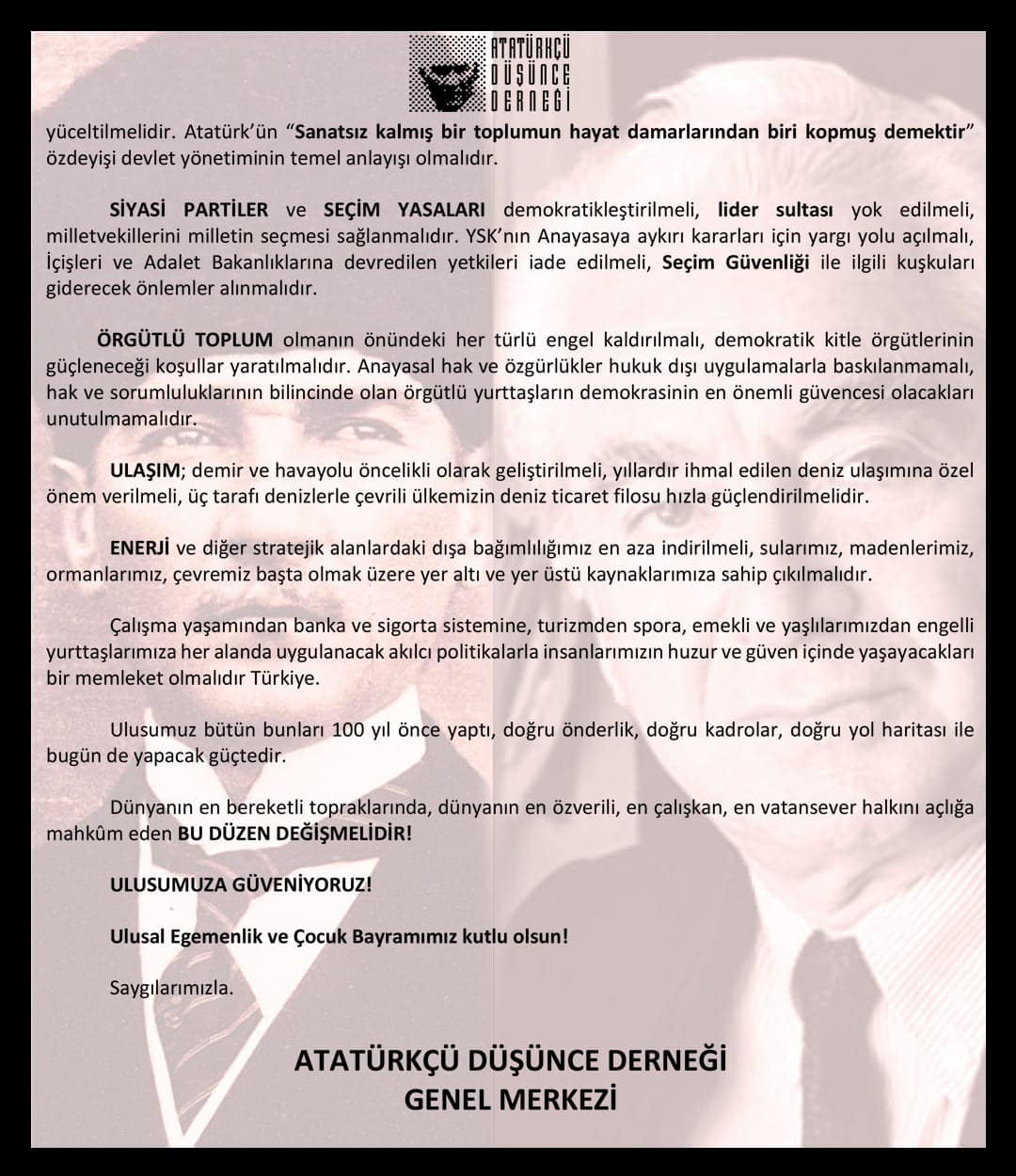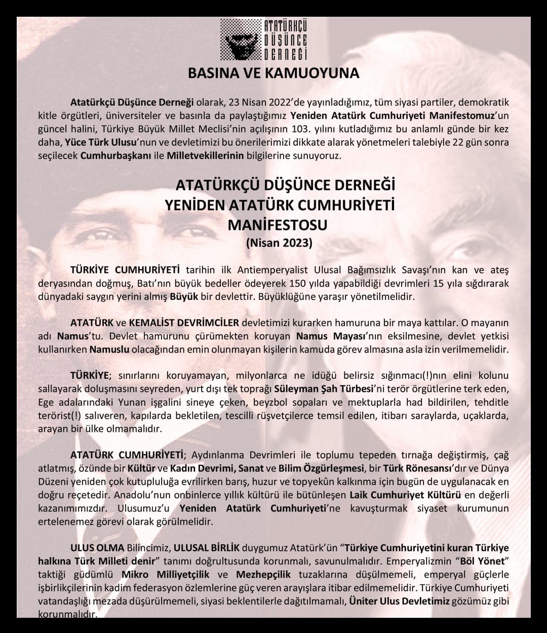 Atatürkçü Düşünce Derneği Genel Başkanı Hüsnü Bozkurt, sosyal medya hesabında 14 Mayıs Cumhurbaşkanlığı ve Milletvekili seçimi öncesi Atatürkçü Düşünce Derneği’nin manifestosunu paylaşmıştı.ADD, Cumhuriyet Halk Partisi Genel Başkanı ve Cumhurbaşkanı adayı Kemal Kılıçdaroğlu’nun seçim yenilgisi üzerine ‘değişim’ çağrılarında bulundu.ADD Genel Başkanı Bozkurt, sosyal medya hesabında tekrar Kılıçdaroğlu’na ‘değişim’ göndermesi yaparak, Atatürk Düşünce Derneği Yeniden Atatürk Cumhuriyeti Manifestosu’nu paylaştı. Gönderme yapan ADD Genel Başkanı Bozkurt,’’ Bir Demokratik Kitle Örgütü Başkanı olarak siyasi partilerle polemiği doğru bulmam. Ancak yaşananlar sabır sınırlarını aştı’’ ifadelerini kullandı.ADD Genel Başkanı Bozkurt’un paylaşımının tamamı ise şöyle:‘’Bir Demokratik Kitle Örgütü Başkanı olarak siyasi partilerle polemiği doğru bulmam.Ancak yaşananlar sabır sınırlarını aştı.Birileri inatla direniyor.Oysa toplum yapılması gerekeni görüyor,sabırsızlıkla bekliyor.Gitmeyi bilmek gerek!#YenidenAtatürkCumhuriyeti@add_genelmerkez’’