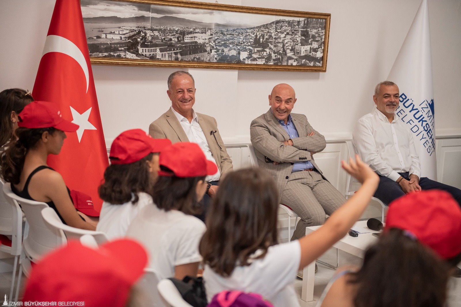 İzmir Büyükşehir Belediye Başkanı Tunç Soyer, Adıyaman’dan misafir etmek üzere kente davet ettiği 39 depremzede çocukla buluştu. İzmir Büyükşehir Belediyesi tarafından 5 gün boyunca İZELMAN A.Ş.’nin Buca’daki tesislerinde konaklayıp kenti gezecek minikler 20 Ağustos’ta Adıyaman’a dönecek. İzmir Büyükşehir Belediyesi Çocuk Belediyesi Şube Müdürlüğü tarafından organize edilen kent gezisinde eğlenceli anlar yaşayan çocuklar İzmir Büyükşehir Belediye Başkanı Tunç Soyer'e teşekkür etti.