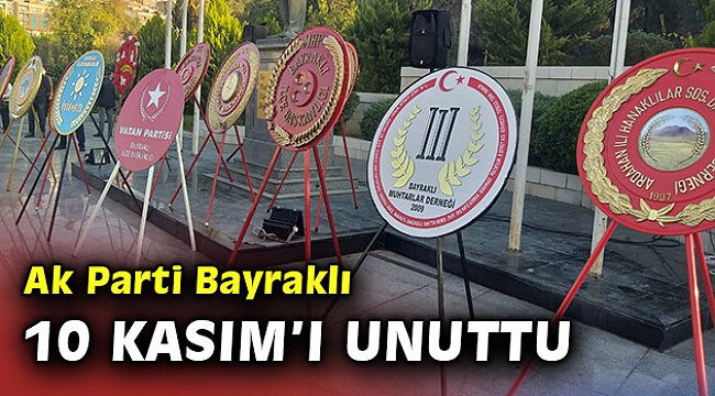 Bu sırada Ak Parti Bayraklı İlçe Başkanlığının çelenk sunmaması dikkat çekti. Cumhur İttifakı ortaklarından MHP Bayraklı İlçe Başkanlığı çelenk sunarken Ak Parti Bayraklı İlçe Başkanlığının çelenk sunmaması, törene katılanlar tarafından '10 Kasım'ı unutmuşlar' şeklinde yorumlandı.