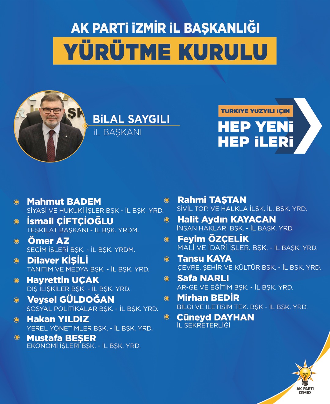 ÖNCÜŞEHİR - AK Parti İzmir İl Başkanı Bilal Saygılı’nın ‘A Takımı’ belli oldu.