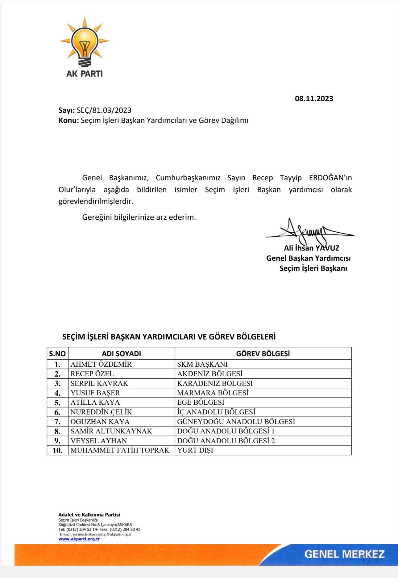 AK Parti İzmir Milletvekili Mahmut Atilla Kaya, Cumhurbaşkanı ve AK Parti Genel Başkanı Recep Tayyip Erdoğan’ın oluruyla, Ege Bölgesi'nden sorumlu olarak Seçim İşleri Başkan Yardımcılığı görevine getirildi.