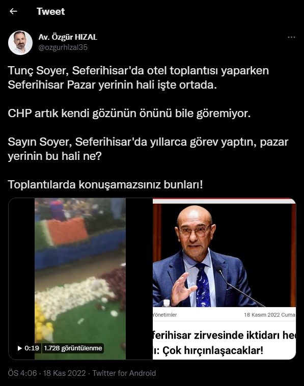 Sayın Soyer, Seferihisar'da yıllarca görev yaptın, pazar yerinin bu hali ne? Toplantılarda konuşamazsınız bunları!"
