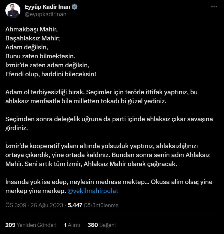 Efendi olup, haddini bileceksin!Adam ol terbiyesizliği bırak. Seçimler için terörle ittifak yaptınız, bu ahlaksız menfaatle bile milletten tokadı bi güzel yediniz.Seçimden sonra delegelik uğruna da parti içinde ahlaksız çıkar savaşına girdiniz.İzmir'de kooperatif yalanı altında yolsuzluk yaptınız, ahlaksızlığınızı ortaya çıkardık, yine ortada kaldınız. Bundan sonra senin adın Ahlaksız Mahir. Seni artık tüm İzmir, Ahlaksız Mahir olarak çağıracak.İnsanda yok ise edep, neylesin medrese mektep... Okusa alim olsa; yine merkep yine merkep.