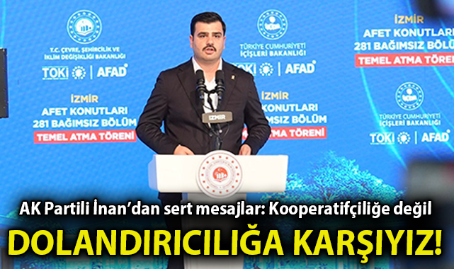 İzmir’de yürütülen kooperatif soruşturması hakkında konuşan İnan, “Değerli arkadaşlar önemli bir yere değinmek istiyorum. Biz kooperatifçiliğe değil, dolandırıcılığa karşıyız! İzmir’de iyi niyetle kurulmuş bir yapıyı, kendi servetine dönüştürenlerin suçunu kimse — evet kimse — “kooperatifçilik” diyerek masumlaştıramaz! Çünkü ortada üretim yok, dayanışma yok, paylaşma yok. Sadece mağdur edilen insanlar var. Alın teriyle, emeğiyle, hayalleriyle dolandırılan insanlar var. Şimdi çıkıp diyorlar ki: “Bir il başkanının tutuklu olduğu nerede görülmüş?” E o zaman biz de diyoruz ki: O soruyu Cumhurbaşkanımıza değil… İzmir’de dolandırılan mağdurlara sorun! Tüm birikimlerini, mal varlıklarını, çoluğunun çocuğunun geleceğini bu kooperatiflere yatıran o insanlara sorun. Onlar anlatsın size bu tablonun nerede görüldüğünü, nasıl yaşandığını, hangi acıyla hissedildiğini tek tek anlatsınlar. Ve madem öyle diyorsun Sayın Özel… Kooperatif yolsuzluğundan yeniden il başkanı çıkaran düzeni de aslında bizim sana sormamız lazım. Evet! Bu düzen; dayanışmanın değil, rantın ve yolsuzluğun düzenidir. Bu düzen; emeği değil, ihaneti büyütmüştür. Bu düzen; İzmir’in adını değil, utancını büyütmüştür. Ama bilinsin ki biz, İzmir’in alın terini, emeğini, umudunu kimsenin şahsi hırslarına teslim etmeyeceğiz” şeklinde konuştu.