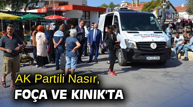 Foça pazar yerini ve esnafı da ziyaret ederek sorunlarını dinleyen AK Parti İzmir Milletvekili Necip Nasır, notlar alarak, talep ve sorunların takipçisi olacağını söyledi.Halkın sorunlarını birebir dinlemek için özel olarak hazırlattığı mobil milletvekili ofisinde vatandaşlarla buluşan Nasır, vatandaşın istek ve beklentilerinin hızlı çözümü konusunda çalışmaya devam edeceklerini kaydetti.KINIK'TA VATANDAŞ İLGİSİSaha ziyareti kapsamında Foça'nın ardından, Kınık'a geçen Nasır, Kaymakam Erol Türkmen'i makamında ziyaret ederek görüş alışverişinde bulundu.AK Parti Kınık İlçe Başkanı Sami Molla Ahmet'le de bir araya gelerek ilçede yürütülen çalışmalar hakkında bilgi alan Nasır, Belediye Başkanı Sadık Doğruer ile ilçedeki proje ve altyapı çalışmalarında gelinen son durumu değerlendirdi.Belediye ziyaretinin ardından S.S. Kınık Esnaf Sanatkarlar Kredi ve Kefalet Kooperatifi Başkanı Yusuf Mert ve Kınık Motorlu Taşıyıcıları Kooperatifi Başkanı Oktay Aslanyörür ile bir araya gelen Necip Nasır, sektör temsilcilerinin beklentilerini titizlikle Ankara'ya ilettiklerini dile getirdi.Nasır, Kınık meydanında mobil milletvekili ofisinde her yaş, kesim ve meslek grubundan vatandaşların istek ve sorunlarını dinledi; sorunların çözümü için 7 gün 24 saat esasıyla çalışmaları sürdürdüklerini de sözlerine ekledi.