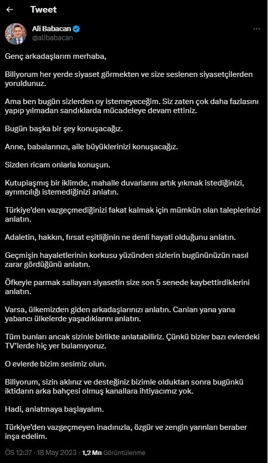 Biliyorum her yerde siyaset görmekten ve size seslenen siyasetçilerden yoruldunuz. Ama ben bugün sizlerden oy istemeyeceğim. Siz zaten çok daha fazlasını yapıp yılmadan sandıklarda mücadeleye devam ettiniz. Bugün başka bir şey konuşacağız. Anne, babalarınızı, aile büyüklerinizi konuşacağız. Sizden ricam onlarla konuşun.“Adaletin, hakkın, fırsat eşitliğinin ne denli hayati olduğunu anlatın”Kutuplaşmış bir iklimde, mahalle duvarlarını artık yıkmak istediğinizi, ayrımcılığı istemediğinizi anlatın. Türkiye’den vazgeçmediğinizi fakat kalmak için mümkün olan taleplerinizi anlatın. Adaletin, hakkın, fırsat eşitliğinin ne denli hayati olduğunu anlatın. Geçmişin hayaletlerinin korkusu yüzünden sizlerin bugününüzün nasıl zarar gördüğünü anlatın. Öfkeyle parmak sallayan siyasetin size son 5 senede kaybettirdiklerini anlatın. Varsa, ülkemizden giden arkadaşlarınızı anlatın. Canları yana yana yabancı ülkelerde yaşadıklarını anlatın. “O evlerde bizim sesimiz olun”Tüm bunları ancak sizinle birlikte anlatabiliriz. Çünkü bizler bazı evlerdeki TV’lerde hiç yer bulamıyoruz. O evlerde bizim sesimiz olun. Biliyorum, sizin aklınız ve desteğiniz bizimle olduktan sonra bugünkü iktidarın arka bahçesi olmuş kanallara ihtiyacımız yok. Hadi, anlatmaya başlayalım. Türkiye’den vazgeçmeyen inadınızla, özgür ve zengin yarınları beraber inşa edelim.