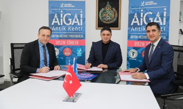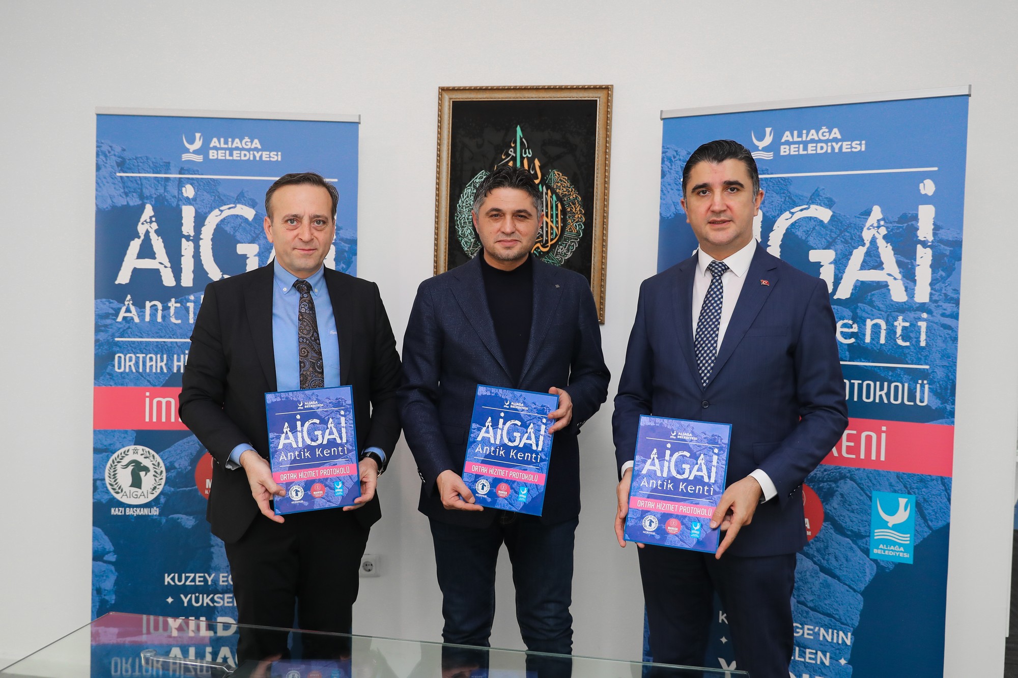 Halen yılda 15 bin tarih ve arkeoloji meraklısının ziyaret ettiği Aliağa- Manisa sınırında bulunan Aigai Antik kentinde devam eden arkeolojik kazıların desteklenmesini içeren protokol, Aliağa Belediyesi, Manisa İl Kültür ve Turizm Müdürlüğü ve Aigai Kazı Başkanlığı arasında imzalandı. Aliağa Belediye Başkanlık makamında gerçekleşen protokol imza törenine; Aliağa Belediye Başkanı Serkan Acar, Manisa İl Kültür ve Turizm Müdürü İbrahim Sudak ve Aigai Arkeolojik Kazı Başkanı, Celal Bayar Üniversitesi Fen-Edebiyat Fakültesi Arkeoloji Bölümü Öğretim Üyesi Prof. Dr. Yusuf Sezgin katıldı.