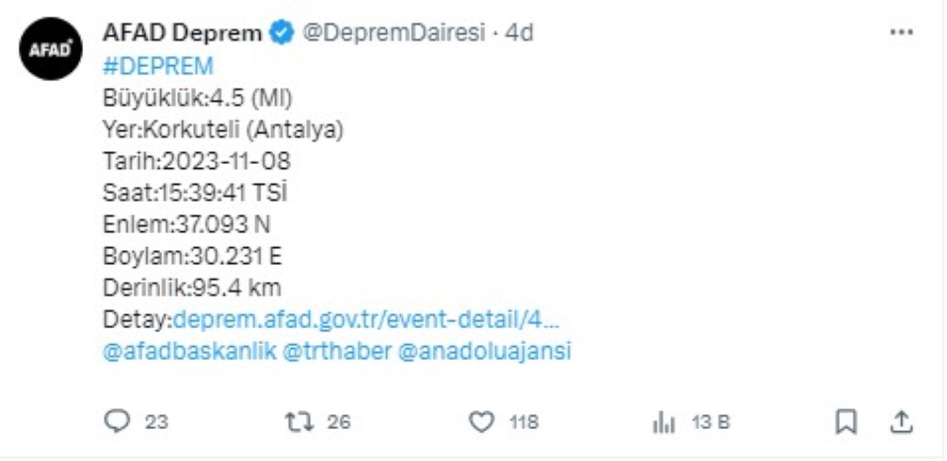 Antalya’da saat 15.39’da 4,5 büyüklüğünde deprem meydana geldi. AFAD, depremin merkez üssünün Korkuteli ilçesi olduğunu açıkladı. Deprem, 95,4 kilometre derinlikte gerçekleşti.