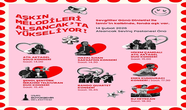 14 Şubat Sevgililer Günü, İzmir Büyükşehir Belediyesi tarafından Alsancak Kıbrıs Şehitleri Caddesi girişinde önünde müzikle kutlanacak. Saat 14.00’te başlayacak programda Atıl Aktagel, Hazal İlhan, Hikem Çamdalı-Atıl Aktagel, Şenol Şentürk-İbrahim Telkıvıran, Bando Quartet, Enes Kunduracı konserleri yapılacak. Saat 18.30’da ise DJ Heyecan sahne alacak. Etkinlik ücretsiz olacak.