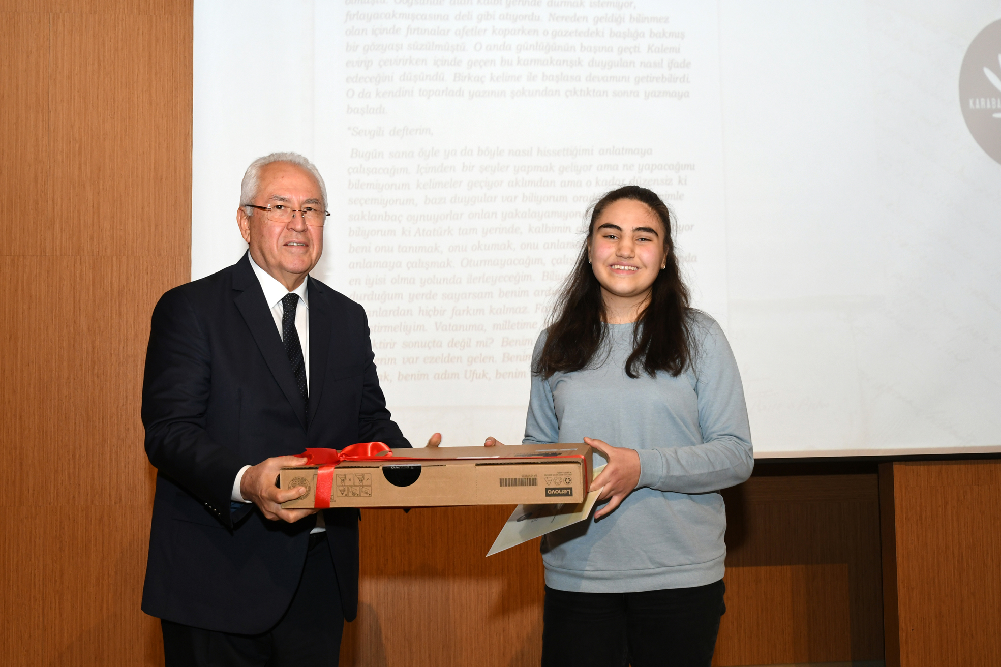 Karabağlar Belediyesi’nin 10 Kasım Atatürk’ü Anma Günü ve Atatürk Haftası kapsamında düzenlediği “Atatürk’ten Mektup Var” konulu kompozisyon yarışmasında dereceye giren öğrencilere ödülleri törenle verildi. Yıldız Kenter Kültür ve Sanat Merkezi’nde gerçekleştirilen törene, Karabağlar Belediye Başkanı Muhittin Selvitopu, meclis üyeleri, Belediye Başkan Yardımcısı Y. Güven Güngörmüş, Seçici Kurul üyeleri, öğretmenler, öğrenciler ve aileleri katıldı.Etkinliğin açılışında konuşan Başkan Selvitopu, Atatürk'ün Samsun'a ayak bastığı 1919 yılından Cumhuriyet'i ilan ettiği 1923'e kadar geçen kısa sürede, çok önemli devrimleri hayata geçirdiğini söyledi. Üstelik bunu 7 düvele karşı savaşırken ve millet iradesini arkasına alarak yaptığını vurgulayan Başkan Selvitopu, “Atatürk, Türkiye Büyük Millet Meclisi'ni açarak halkın iradesini kurtuluş mücadelesine katan bir lider. Bunun önemini çocuklarımıza, gelecek kuşaklarımıza çok iyi anlatmamız gerekiyor. O, kısacık ömründe bir anını bile boş bırakmadı. Hasta olduğu o son günlerinde bile Hatay'ın anavatana katılması için uğraştı. İşte lider olmak işte böyle bir şey” dedi.