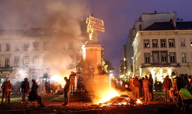 AB ülkelerindeki çiftçilerin isyanı giderek büyüyor. Tarım politikalarına karşı protestolarını sürdüren çiftçiler, gece saatlerinden itibaren traktörleriyle AB’nin kalbi Brüksel’deki Avrupa Parlamentosu’na (AP) doğru yola çıktı. Korna sesleri eşliğinde AP binasına ulaşan çiftçiler, bin 200 traktörle yolları trafiğe kapattı. AB liderlerinin zirve için bir araya geldiği binanın yakınlarında bulunan çiftçiler, AP binası önünde ateş yaktı. Bina önündeki güvenlik bariyerlerini yıkmaya çalışan çiftçilere müdahale gecikmedi. Polis, kalabalığa tazyikli su ve göz yaşartıcı gazla müdahale etti.