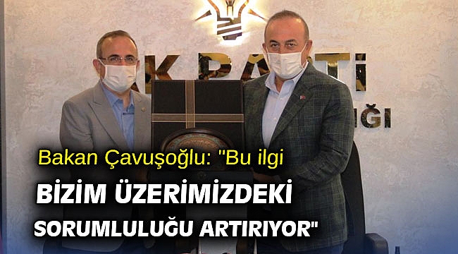 Çavuşoğlu, İzmirlilerin AK Parti'ye ilgi gösterdiğini dile getirerek, "Bu ilgi bizim üzerimizdeki sorumluluğu artırıyor. İzmir'e ve İzmirlilere daha çok hizmet etmemiz gerektiğini hatırlatıyor. İnşallah arkadaşlarımızla birlikte Cumhurbaşkanımız liderliğinde tüm bakanlıklarımız ve milletvekillerimizin de yakından takibiyle daha güzel hizmet getireceğiz" diye konuştu.AK Parti İzmir İl Başkanı Kerem Ali Sürekli de ziyaretinden dolayı Bakan Çavuşoğlu'na teşekkür ederek hediye takdiminde bulundu.