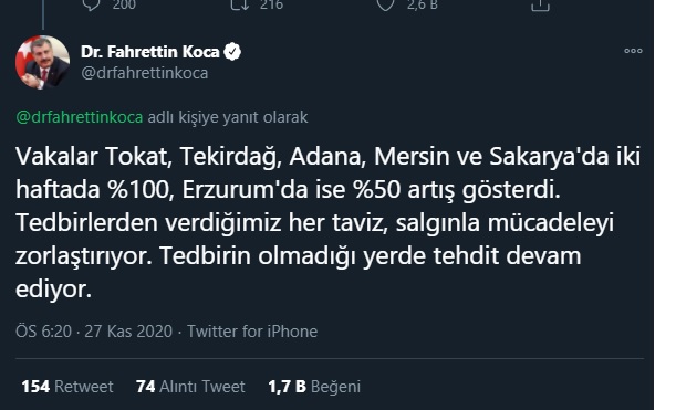 Vakalar Tokat, Tekirdağ, Adana, Mersin ve Sakarya'da iki haftada %100, Erzurum'da ise %50 artış gösterdi. Tedbirlerden verdiğimiz her taviz, salgınla mücadeleyi zorlaştırıyor. Tedbirin olmadığı yerde tehdit devam ediyor" dedi.