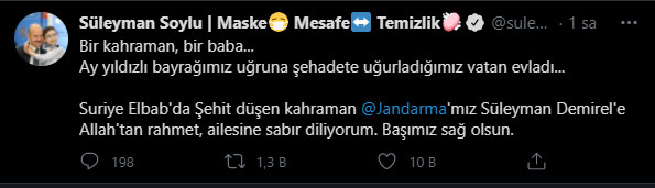 İçişleri Bakanı Süleyman Soylu acı haberi sosyal medya hesabından duyurdu. Bakan Soylu yaptığı paylaşımda "Bir kahraman, bir baba... Ay yıldızlı bayrağımız uğruna şehadete uğurladığımız vatan evladı... Suriye Elbab'da Şehit düşen kahraman Jandarma'mız Süleyman Demirel'e Allah'tan rahmet, ailesine sabır diliyorum. Başımız sağ olsun" dedi.