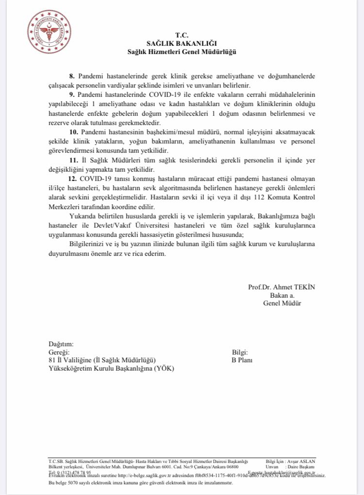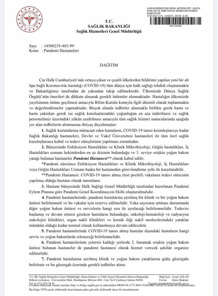 Sağlık Bakanlığı, Türkiye çapında tüm hastanelere yeni tip koronavirüs (COVİD-19) genelgesi gönderdi ve alınacak tedbirleri sıraladı.12 maddelik genelgede; hangi hastanelerin ‘pandemi hastanesi’ olarak nitelendirileceği açıklandı, hastane yönetimlerinin alması gereken önlemler anlatıldı. Genelgede; ‘Sağlık kurumlarına müracaat eden hastaların, COVID-19 tanısı kesinleşinceye kadar Sağlık Bakanlığı hastaneleri, devlet ve vakıf üniversitesi hastaneleri ile tüm özel sağlık kuruluşlarınca kabul ve tedavi süreçlerinin yapılması zorunludur’ denildi.Genelgenin 2. Maddesinde de ‘Bünyesinde enfeksiyon hastalıkları ve klinik mikrobiyoloji, göğüs hastalıkları, iç hastalıkları uzmanı hekimlerden en az ikisinin bulunduğu ve 3. Seviyede erişkin yoğun bakım yatağı bulunan hastaneler pandemi hastanesi olarak kabul edilir’ denildi. Genelgede, ‘Pandemi hastanelerinde, COVID-19 tanısı almış hastalar dışındaki hastaların hangi servis ve bakımlarda izleneceği belirlenmelidir’ ifadesi kullanıldı.Pandemi hastanelerinin yetersiz kaldığı yerlerde ise 2. Basamak erişkin yoğun bakım ünitesi bulunan hastanelerin de pandemi hastanesi olarak hizmet verecek şekilde organize edilmesi gerektiği belirtildi.Genelgenin 4. Maddesinde de; ‘Pandemi hastanelerinde, pandemi hastalarına ayrılmış bir klinik ve bir yoğun bakım ünitesi belirlenmeli ve bu vakalar için rezerve edilmelidir. Vaka sayısının artması durumunda diğer yoğun bakım ünitesi ve servislerin hangi sıra ile ayrılacağı belirlenmelidir. Tedavisi başlamış ve devam etmesi gereken hastaların bulunduğu; onkoloji-hematoloji ve radyasyon onkolojisi klinikleri, organ nakil klinikleri ve kemik iliği nakil merkezlerindeki yataklar mümkün olduğu kadar normal olarak kullanılmaya devam edilecektir’ dendi.İşte o genelge: