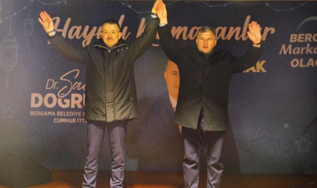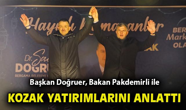 Başkan Doğruer bakanlığı döneminde Bergama’ya özellikle Kozak bölgesine göstermiş olduğu hassasiyet ve yatırımlar için Bakan Pakdemirli’ye teşekkür ederken “Sayın Bakanımız bölgemizi ve sorunlarını çok iyi bilmektedir. Özellikle Kozak’ta tarım yatırımları anlamında çok büyük emeği var. Her zaman, her sorumuzda kapısını çaldık ve çareyi bulduk. Diliyorum ki hep birlikte Bergama için, Kozak için daha çok çalışacak, projeler üretecek, çiftçinin üreticinin yanında olacağız. Kendisine çok teşekkür ediyorum.” dedi.Bakan Pakdemirli yaptığı konuşmasında Bergama’nın artık aldığı yatırımlar, bölgesel avantajı ve Başkan Doğruer’in vizyonu ile İl olma yolunda emin adımlarla ilerlediğini belirterek “İstanbul Otoyolu açıldıktan sonra Bergama ve Kozak’ta artık eski Bergama ve Kozak olmayacak. Çünkü buralara hizmet gelecek. Buralara insanlarımız gelerek taşınacak ve buralardaki hayat eskiye oranla daha müferreh olacak. Ama bu şartları da sağlayabilecek belediyeciliği yapabilecek ilçe yöneticilerine ihtiyaç var. Doktor Sadık Doğruer’i Kınık’tan hepiniz tanıyorsunuz, yaptıkları ortada ve yapacaklarını da Bergama için zaten söylüyor. Onun söz verdiği her şeyin arkasındayız. 2019’da geldiğimde şunu söylemiştim: ‘Hakan Koştu Başkan çalışacak. Bekir Pakdemirli temelli destek olacak.’ demiştim ve sözümüzü tuttum. Her zaman destek olduk bundan sonrası için de bugün aynı şeyleri söylüyoruz. Doktor Sadık Başkan çalışacak Bekir Pakdemirli destek olacak. Çünkü, sizlere efelik, efendilik yapmaya gelmedik hizmetkarlık yapmaya geldik. İnşallah gereğini yapacağız. Benim Kozak’a bir mahcubiyetim var. Bu çam kozalağı meselesini biliyorum çözemedik. Fakat arkadaşlarımız halen çalışıyor. Ben sürekli olarak bilgi alıyorum. Yine birtakım parazitleri alana saldılar bazı iyileşmeler var ama henüz bitmiş değil. Tabii ki bu sorun dünyada da çözülmüş bir mesele değil. Ama İnşallah bunu da çözeceğiz. Hamza Dağ başkan gelmiş burada sözü vermiş biz de arkasında oluruz ve ormandan da destekleriz. Sadık Başkana da her türlü mutlaka destek olacağız. Kozak çevre yolu konusunu da bundan sonra ben de konun takipçisiyim. Zaten İzmir’den bir arkadaşımız şu an Ulaştırma Bakanı O da hemşerimiz sayılır inşallah ona yaptıracağız. Söyleyebileceğim şey şu; arabanın ön tekeriyle arka tekerlerinin farklı gitmemesi lazım üçünün bir arada olması lazım. Hatta bu dönem iyi bir hava var. İzmir’de Hamza Başkan İzmir’i İnşallah alacak. Hamza Başkan İzmir’i alırken, Doktor Sadık da inşallah sizlerin oyları ile Bergama’yı alacak. Hükümet de zaten 2028’e kadar bizde. Üçlü ve güçlü güzel işler yapılacak. Biz ne gerekiyorsa yaparız. Biz Bergama’nın emrindeyiz Kozak’ın emrindeyiz İzmir’imizin, memleketimizin emrindeyiz. Emrinde de olmaya devam edeceğiz inşallah. Bizim dönemimizde yapılan 8 tane baraj bir tane yeraltı depolama tesisi 6 sulama 10 Taşkın koruma tesisi yapılmış. Şu an Kırcalar Barajı’nın sulaması %50’ye geldi. Musacalı da benim dönemimde açıldı. Yani bunların hepsini yaptık. Kalanları da yapmaya devam edeceğiz. Sadık Başkanı destekleyeceğiz.” dedi.