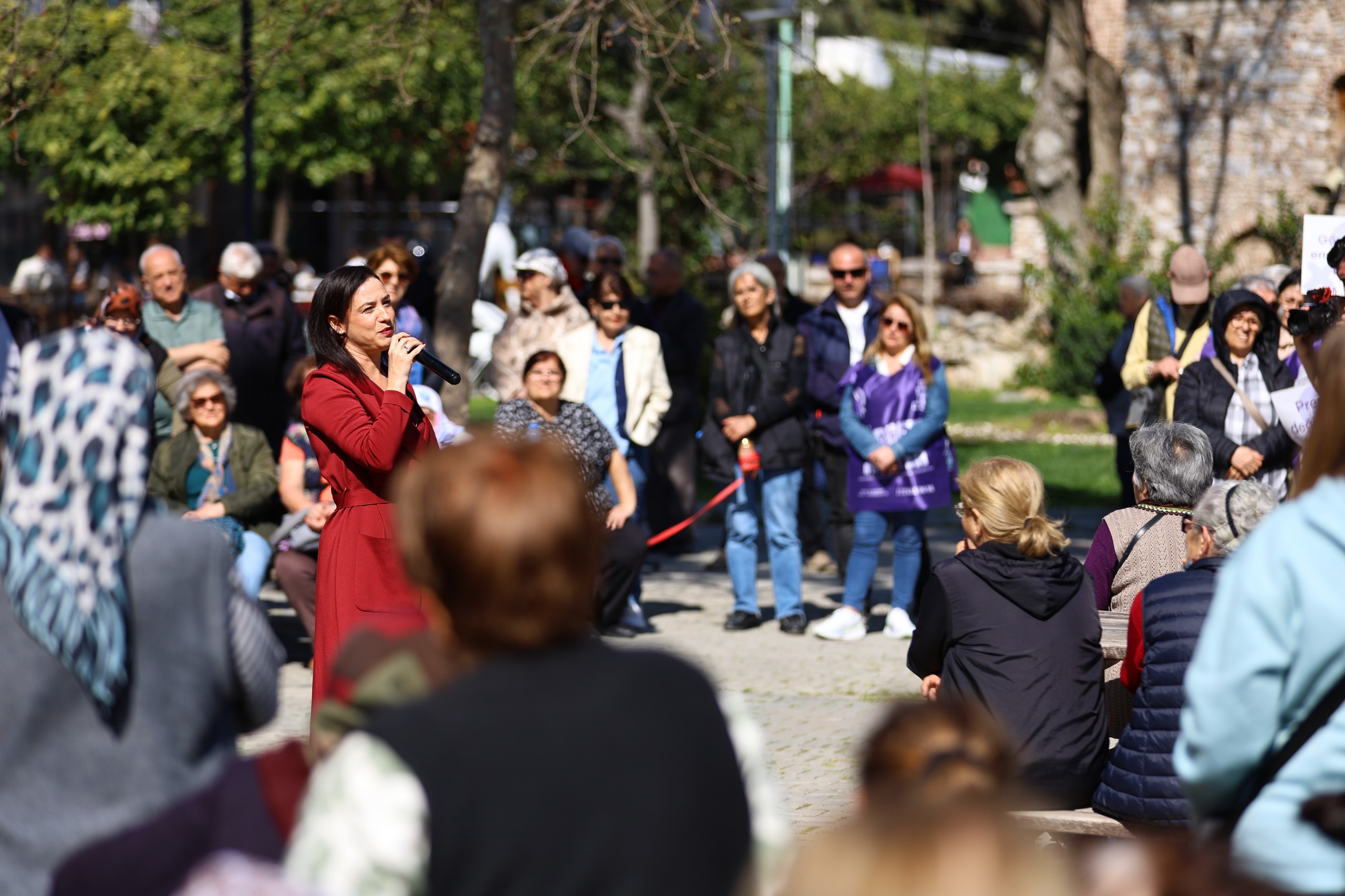 “GÜÇLÜ KADIN, KADINLARA SAHİP ÇIKAN KADINDIR”Ayşe Kaçer’in ardından konuşan Efes Selçuk Belediye Başkanı Filiz Ceritoğlu Sengel, güçlü ve cesur kadın vurgusu yaptı. Başkan Sengel konuşmasında;“Bu ilçenin en cesur kadınları; komşusunun zulüm gördüğünü fark edip polise haber veren, iş arkadaşının istismara uğradığını gördüğünde sessiz kalmayan, çocuklarının ve öğrencilerinin şiddet altında olduğunu fark edip harekete geçen kadınlardır. Kadına gerçekten sahip çıkan kadınlardır. Güçlü kadın, kadınlara sahip çıkan kadındır” dedi.