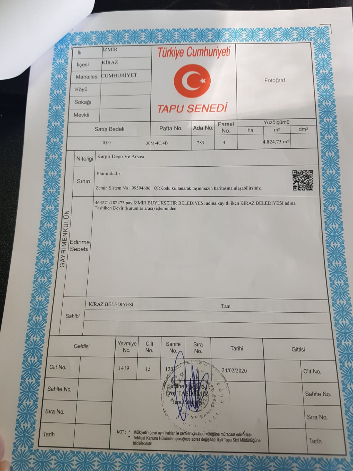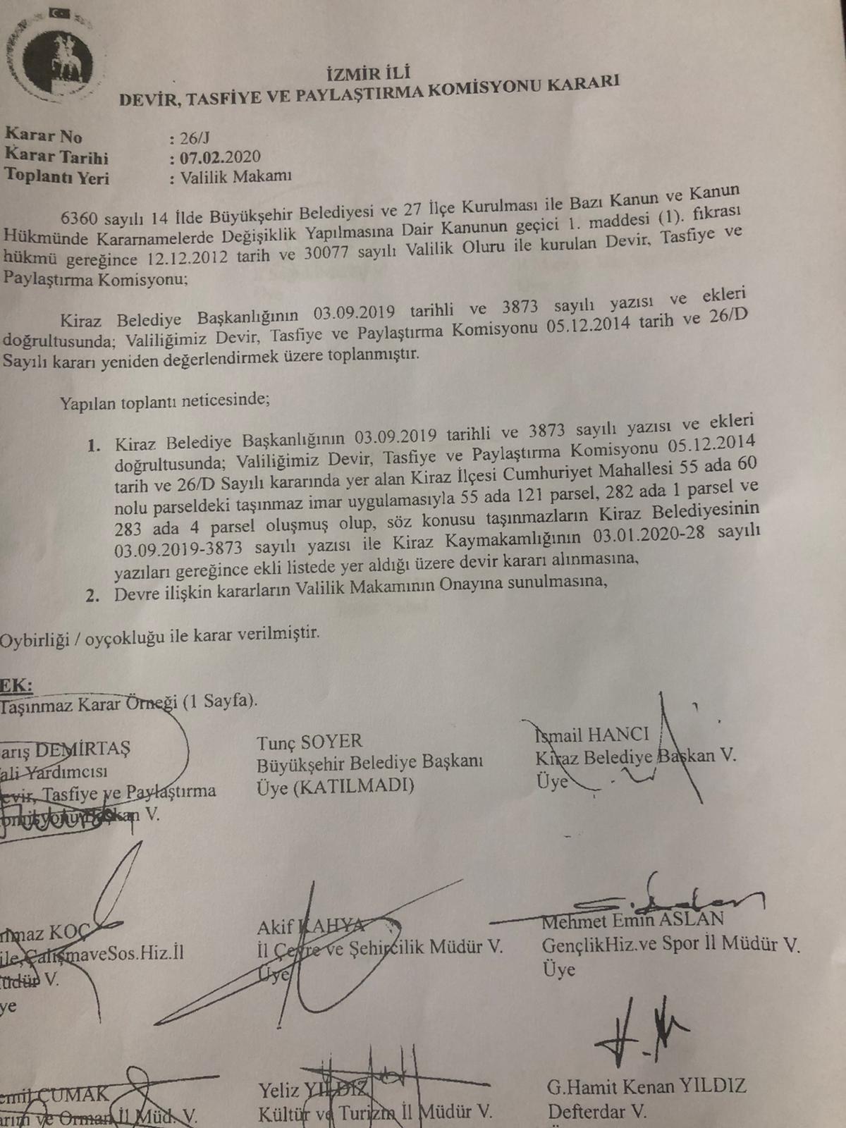 Ancak arsanın tapusu Kiraz Belediyesine devredildikten sonra İzmir Büyükşehir meclisinin gündemine ilginç bir başkanlık önergesi geldi. Önergede toplam alanı 4 bin 827 metrekare olan arsanın 4 bin 632 metrekaresinin İzmir Büyükşehir Belediyesine ait olduğu, kalan 192 metrekarelik Kiraz Belediyesine ait kısmın da kamulaştırılması için meclisten yetki talep ediliyordu. Bunun üzerine Ak Parti Meclis Üyesi Hakan Yıldız, sözü edilen arsanın tamamının İzmir Valiliği Devir Komisyonu tarafından Kiraz Belediyesine verildiğini belirterek, arsanın tamamının Kiraz Belediyesine ait olduğuna dair tapuyu Başkan Soyer ve meclis üyelerine gösterdi. Mecliste yaşanan tartışmaların ardından İzmir Büyükşehir Belediye Başkanı Tunç Soyer, bu önergenin gündemde bırakılmasını oyladı ve önerge yeniden değerlendirilmek üzere oy birliği ile komisyona geri gönderildi.