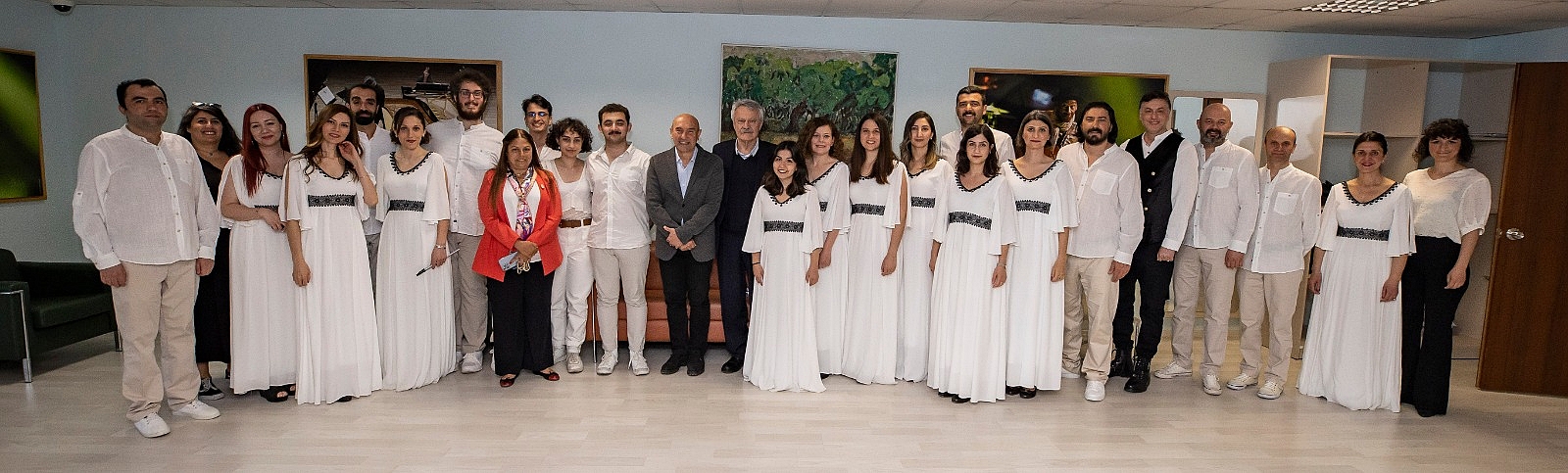 Başkan Soyer Ege’nin iki yakasındaki halkların dostluğuna değinerek, “Bu yıl İzmir’in yani bu memleketin kuruluşunun ve kurtuluşunun simgesi İzmir’in kurtuluşunun 100’üncü yılı. 100’üncü yılın aslında en büyük zaferi barış. Barışı 100 yıldır sürdürüyor olmamız… Barışın en güzel dili de müzik. Çünkü farklı diller konuşsa da insanlar müziğin ortak melodisi eğer aynı bam telini titretiyorsa yüreklerde o iki yakanın insanları arasında çok ortak payda var demektir. Bu akşam dinleyeceğimiz Ruhi Su Korosu ve Alexandra Gravas aslında bize bunu bir kere daha hatırlatacak. Emin olun ki her iki yakanın insanlarında da aynı bam telini titretecek müzikler dinleyeceğiz. Dilerim bu bize aynı zamanda ne kadar çok ortak paydamız olduğunu bir kez daha hatırlatır” ifadelerini kullandı.