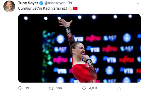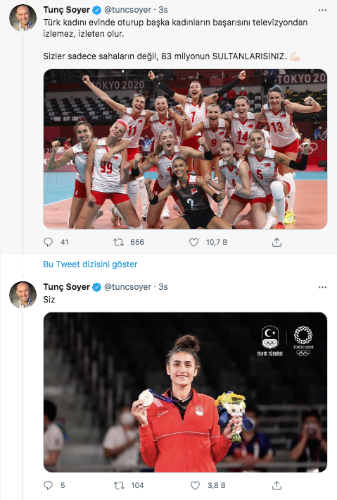 Şenocak'ın mesajına tepki gösteren bir diğer isim de İzmir Büyükşehir Belediye Başkanı Tunç Soyer oldu. Başkan Soyer, paylaşımında, " “Türk kadını evinde oturup başka kadınların başarısını televizyondan izlemez, izleten olur. Sizler sadece sahaların değil, 83 milyonun SULTANLARISINIZ. Çünkü siz Cumhuriyet’in kadınlarısınız" ifadelerini kullandı.