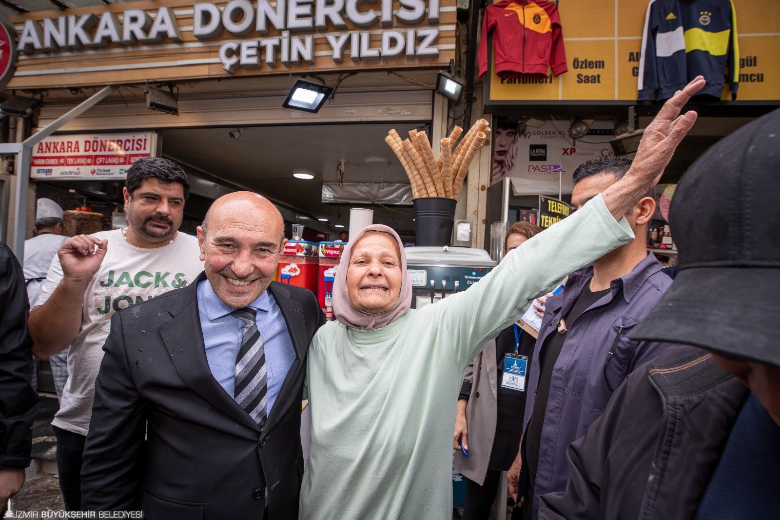 İzmir Büyükşehir Belediyesi’nin Kemeraltı’na verdiği hizmetleri memnuniyetle karşılayan esnaf hem Başkan Soyer’e hem de ekiplere teşekkür etti. Esnaf Hasan Emre Alp, Başkan Soyer’e büyük bir nazar boncuğu kolyesi hediye ederken, “Başkanım gözü olanın gözü çıksın. Bize bahar geldi, Kemeraltı’na baharı getirdiniz” dedi.