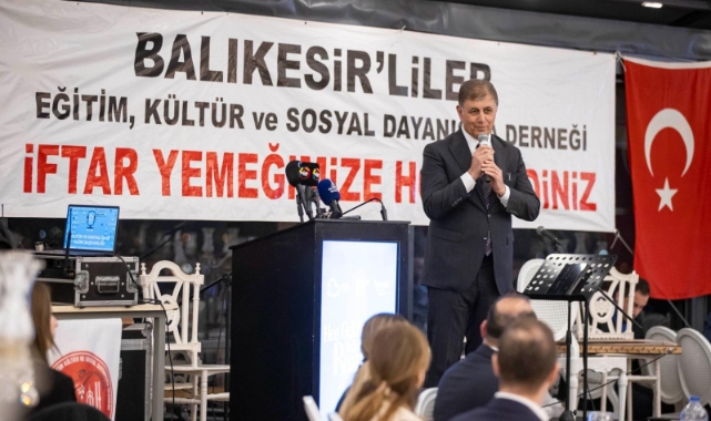 İftara katılan konuklara hitap eden Başkan Dr. Cemil Tugay, "İzmir, dünyanın nadir şehirlerinden biridir. Farklı yerlerden gelip burada yaşayan herkesin kucaklandığı, birlik ve bütünlük içinde bir mozaik haline gelen bir şehir. Balıkesirli ve İzmirli kimliklerini birleştirerek insanları kucaklayan bir şehir bu. Biz İzmir’imizle gurur duyuyoruz. Balıkesir’i ve Manisa’yı da İzmir’den hiçbir zaman ayırmadık. İzmir işgal edildiğinde ayağa kalkan kahraman Balıkesirlileri, Kuvayı Milliyecileri İzmir hiçbir zaman unutmaz. Siz ne kadar İzmirliyseniz, biz de o kadar Balıkesirliyiz. Bu geçmişte böyleydi, bundan sonra da böyle olacak" dedi.