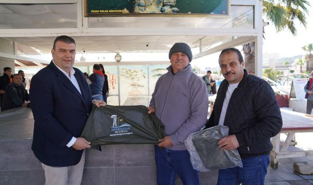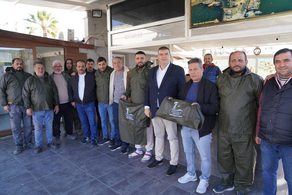 Sığacık Su Ürünleri Kooperatifi üyesi balıkçıların talep ve sıkıntılarını dinleyen Başkan Yetişkin Sığacıklı balıkçılara yağmurluk hediye etti.