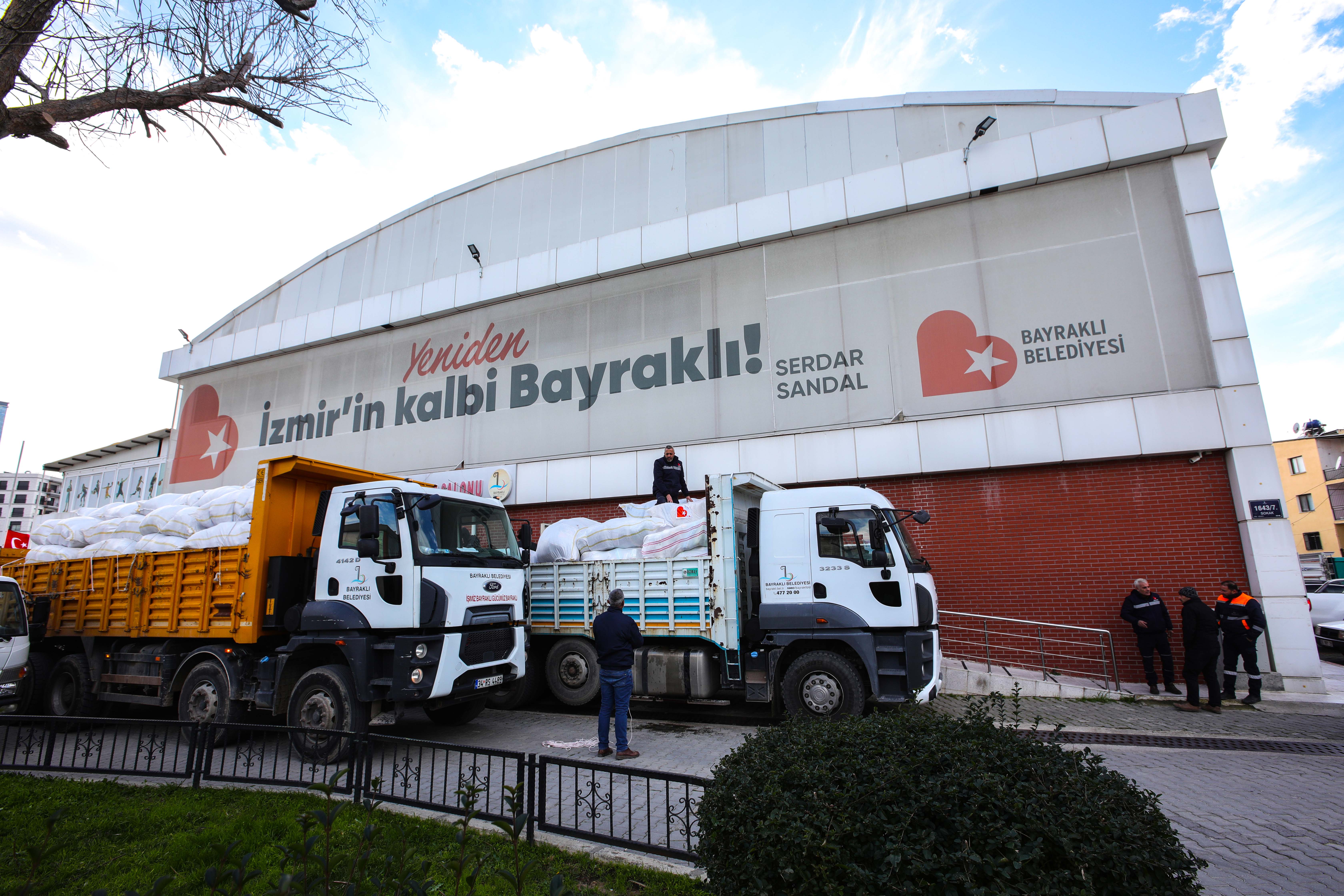 Bayraklı’da depremin ilk gününde başlatılan yardım seferberliği gün geçtikçe büyürken deprem bölgesine iletilen yüzbinlerce ihtiyaç malzemesi afet mağdurlarına umut oldu. Yaraları sarmak için canla başla gece gündüz demeden gönüllü ordusuyla birlikte çalışan Bayraklı Belediyesinde tek merkezde toplanan yardım kolileri ayrıştırılıp paketlenerek hızla deprem bölgesine iletildi. 24 tır ve kamyonlar dolusu eşya depremzedelere ulaştırıldı. Bu kapsamda 500 bine yakın gıda ürünü, 101 bin bebek gıda ve çocuk bakım ürünü, 74 bin giyim eşyası, 57 bin şişe su, 83 bin hijyen malzemesi, 27 bin çeşit ev eşyası, 91 soba, 209 çadır ve 24 seyyar tuvalet gibi ihtiyaç ürünleri tırlarla bölgeye gönderildi.