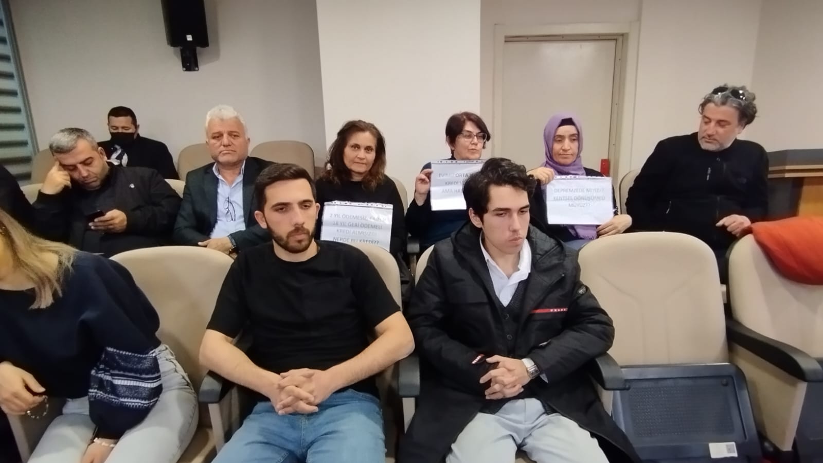 İZDEDA Başkanı Haydar Özkan ve derneğin yönetim kurulu üyelerinin de katıldığı oturumda depremzedeler, döviz açtı. Açıkları dövizlerle emsal artışıyla ilgili “yürütmeyi durdurma” kararı verilmesini ve bir önceki oturumda kavgaya neden olan Bayraklı’nın “afet bölgesi” ilan edilmemesi kararına sessiz tepki gösterdiler.