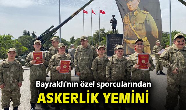 Engelliler Haftası kapsamında Bayraklı Belediyesi kursiyerlerinden 19 engelli genç, bir günlük temsili askerlik vazifelerini yerine getirip, yemin etti. Bu kapsamda Bornova 57’nci Topçu Tugayı’nda yemin töreni düzenlendi. Toplamda 108 kişinin katıldığı törende aileler de duygu dolu anlar yaşadı. Bayraklı Belediyesinin spor branşlarındaki kurslarına katılan 19 engelli birey için yemin töreni öncesi Şehit Ümit Boz Spor Tesislerinde kına töreni de yapıldı. Şarkılar ve marşlar eşliğinde eğlenen gençlerin mutluluğu görülmeye değerdi. Vatani görev öncesi ellerine kına yakılan gençler, ailelerine duygu dolu anlar yaşattı. Elleri kınalı engelli gençler, Türk bayrağı üzerine el basarak yemin etti. Hep bir ağızdan “en büyük asker bizim asker” sloganları atıldı. Terhis belgelerini alan erler, yaptıkları tören geçişi ile ailelerini gururlandırdı.