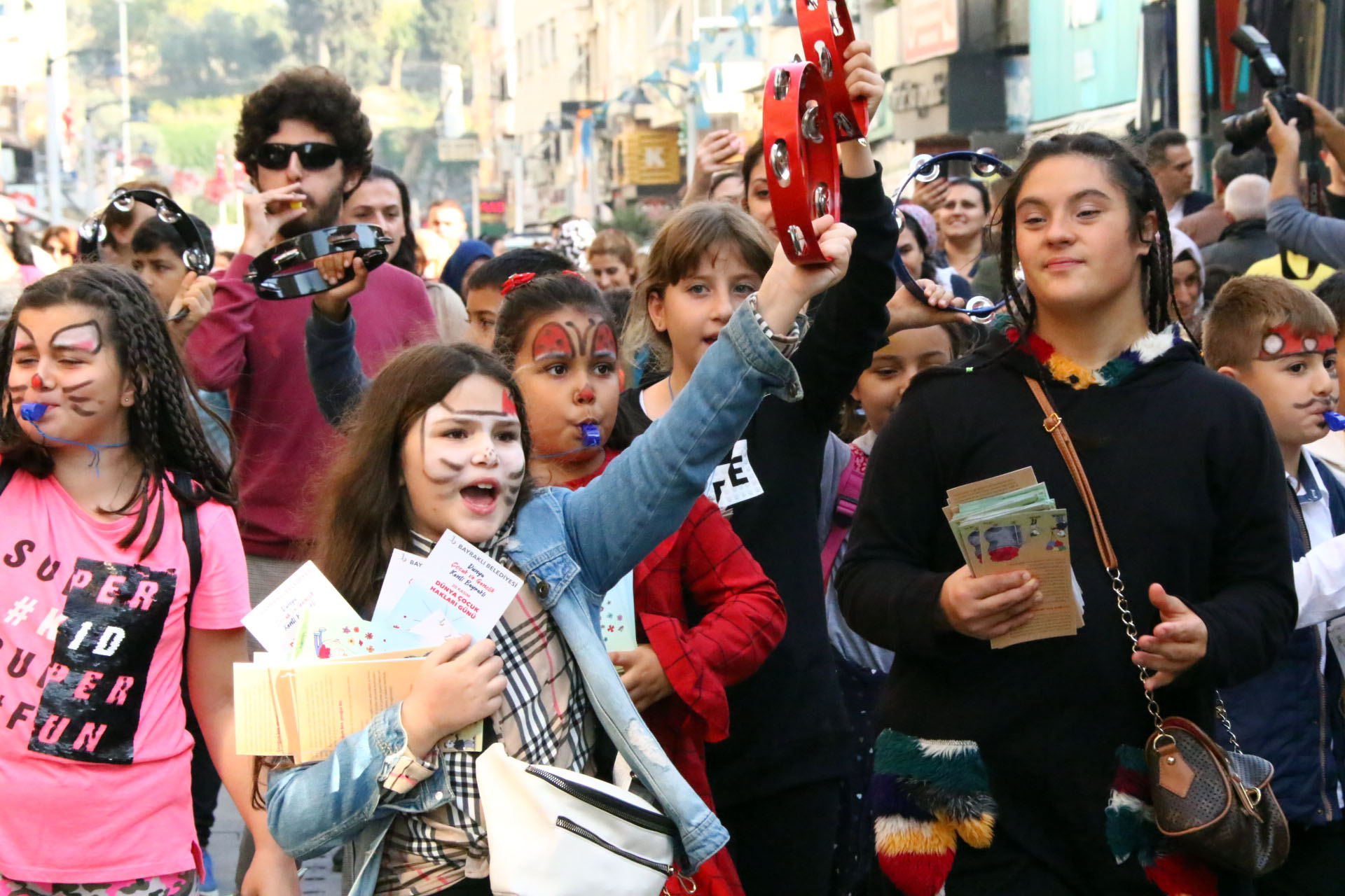 Bayraklı Belediyesi Kültür ve Sosyal İşler Müdürlüğü, 'Dünya Çocuk Hakları Günü' dolayısıyla bir dizi etkinliğin yer aldığı program hazırladı. 'Dünya Çocuk ve Gençlik Kenti Bayraklı' vizyon projesi açısından da önem taşıyan etkinliklerde öğrenciler renkli görüntüler oluşturdu. Bu kapsamda Gümüşpala, Haşim İşcan Caddesi ve Sevgi Yolu'nda çocuk haklarıyla ilgili vatandaşa broşürler dağıtan çocuklar, seslerini duyurabilmek için farkındalık etkinliğine katıldı. Yüzlerini çeşitli figürlerle boyayan çocuklar, Sevgi Yolu Atatürk Anıtı'ndan Bayraklı Belediyesine kadar ellerindeki tefler, ziller ve düdüklerle yürüdü. 'Bu hafta 'Dünya Çocuk Hakları Haftası.' Haklarımızı unutmayalım, haklarımızı koruyalım' sloganlarıyla vatandaşlara çağrıda bulunan çocuklar, yürüyüş sonrasında ise Bayraklı Belediye Başkanı Serdar Sandal'ı ziyaret etti.