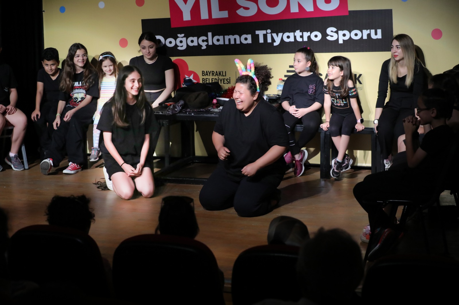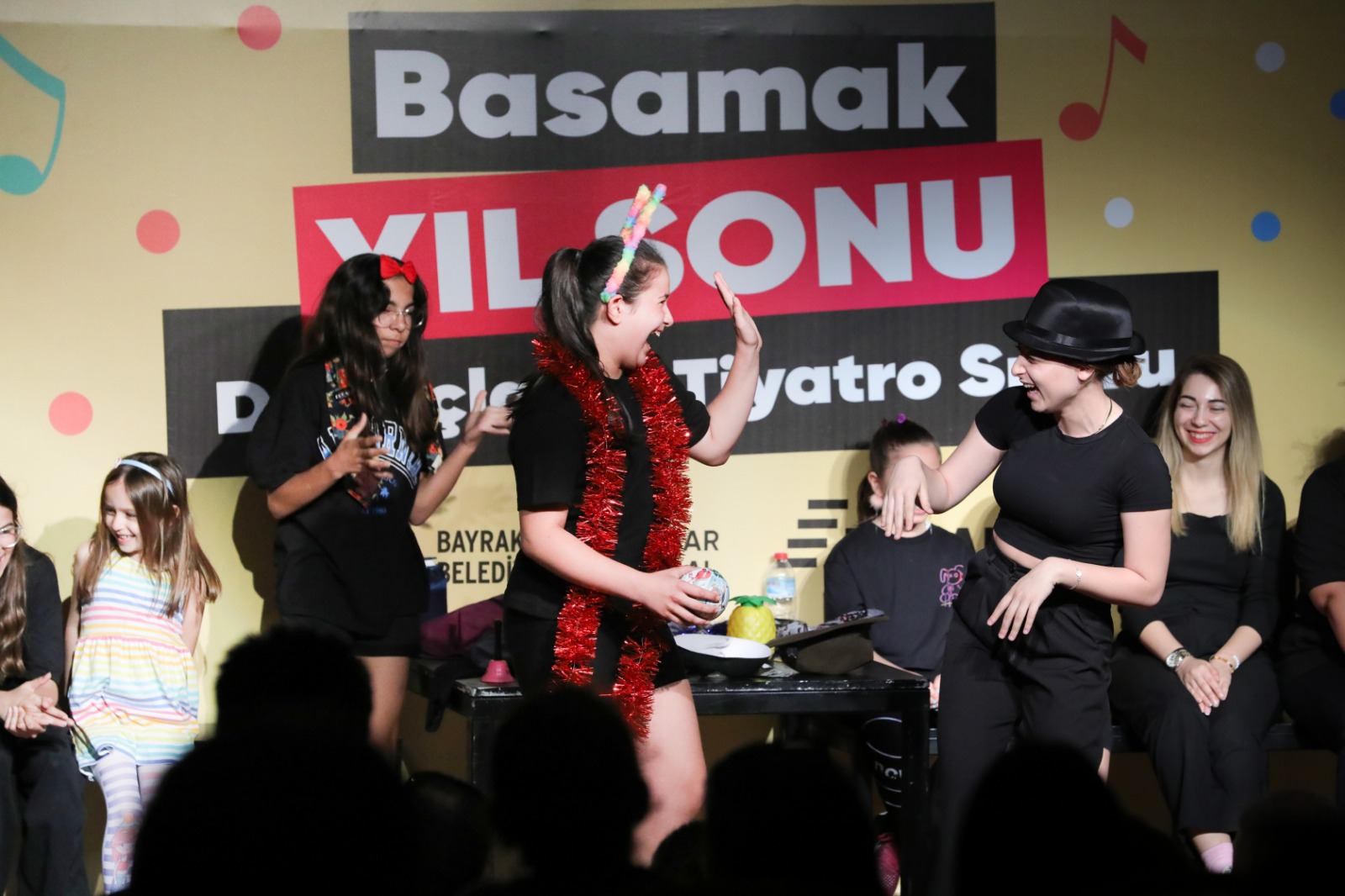 İZLEYİCİLERDEN TAM NOTBayraklı Sanat ve Müzik Akademisi (BASAMAK) kursiyerleri, yıl sonu gösterileriyle yüzlerce sanatseveri bir araya getirmeye devam ediyor. Resimden koroya, tiyatrodan piyanoya kadar birçok branşta verilen kurslara katılan çocuklar, okulların kapanmasının ardından eğitmenleri eşliğinde hazırladıkları gösterilerle izleyiciden tam not alıyor. Son olarak Doğaçlama Tiyatro Sporu ile seyirci karşısına çıkan Bayraklılı kursiyerler, birbirinden farklı konular üzerine sahnede doğaçlama yaparak salonu kahkahaya boğdu. Osmangazi Hizmet Binası Konferans Salonu’ndaki gösteri uzun süre ayakta alkışlandı.