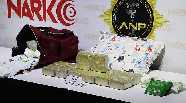 Öte yandan, operasyonlar kapsamında emniyet güçleri bir kadının İstanbul’dan Ankara’ya piyasaya sürmek üzere uyuşturucu getireceği istihbaratı üzerine çalışma başlattı. Kadının bindiği otobüs takibe alınarak, İstanbul yolu Göksu uygulama noktasında durduruldu. Yapılan aramada kadının kucağındaki 8 aylık bebeğin çantasının içerisinde kalıp halinde 7 kilo 150 gram eroin ele geçirildi.