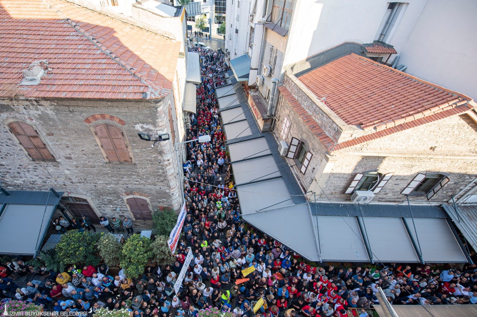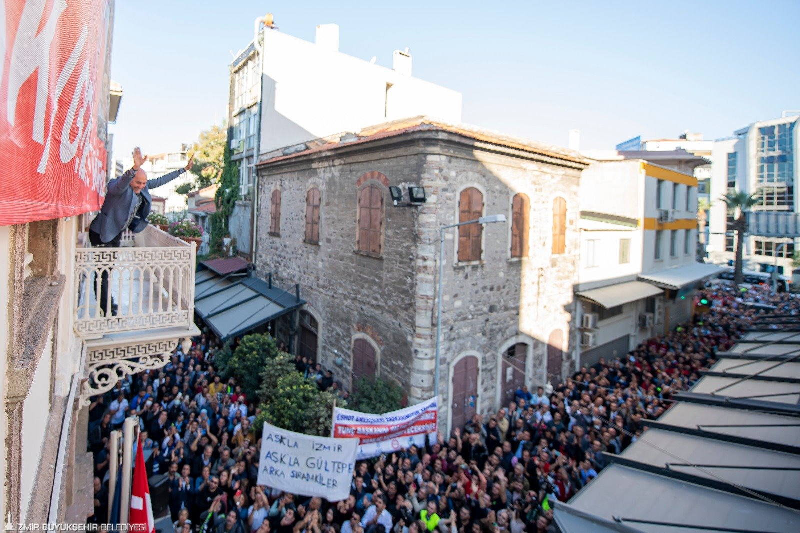 Balkondan işçileri selamladıDİSK Ege Bölge Temsilcisi Memiş Sarı “Biz demokrasi diyoruz, işçinin ekmeği diyoruz. Demokrasiye sahip çıktığımız için bugün buradayız. Bugün açılan o haksız davalar için emekçiler başkanına sahip çıkıyor. Emekçiler oylarına sahip çıkıyor. Başkanım sizinle omuz omuzayız” dedi.