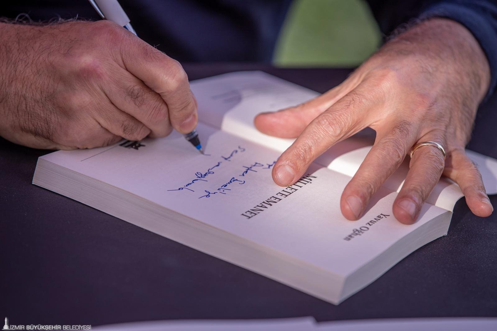 İzmir Büyükşehir Belediye Başkanı Dr. Cemil Tugay, Kültürpark’ta kapılarını açan İZKİTAPFEST - 6. İzmir Kitap Fuarı kapsamında, tutuklu İstanbul Büyükşehir Belediye Başkanı Ekrem İmamoğlu adına gazeteci Yavuz Oğhan’ın kaleme aldığı “Millete Emanet” kitabını İzmirliler için imzaladı. Ekrem İmamoğlu’nun yaşamını, mücadelesini ve ortaya koyduğu çalışmaları anlatan kitabın imza günü, İZKİTAPFEST’in ikinci gününde, Pakistan Pavyonu yanındaki imza alanında gerçekleştirildi. İmza öncesi Kültürpark’a gelen kitapseverlerle kucaklaşan Başkan Tugay, ardından İzmirlilerin kitaplarını imzaladı. Uzun kuyrukların oluştuğu imza etkinliği yaklaşık iki saat sürdü.