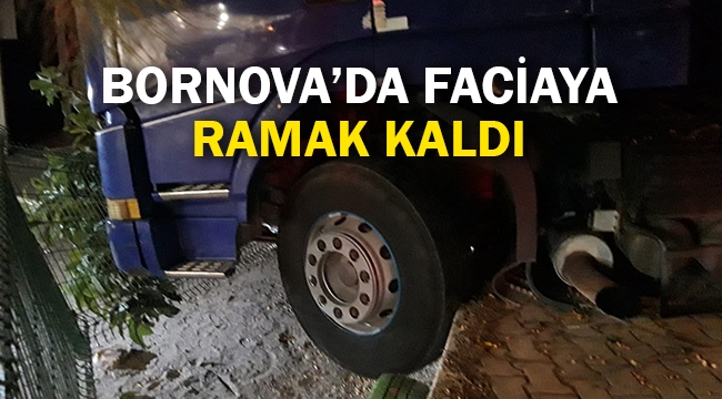 Bornova’nin İnönü Mahallesi Şehit Mustafa Caddesi üzerinde yokuş yukarı park edilen tır, akşam saatlerinde iddiaya göre firenin boşalması sonucu kendiliğinden hareket etti. Yokuş aşağı hızlanan tır, önce park halindeki ticari bir araca çarparak hasar verdi. Ardından kaldırıma çıkarak, bir apartmanın bahçesine girdi.Şans eseri kaldırım üzerinde asılı kalan tır, binaya çarpmadan durabildi.Akşam saatlerinde işlek olmasına rağmen kazada, ölen ya da yaralanan olmaması yüreklere su serpti.Polis olayla ilgili soruşturma başlattı.