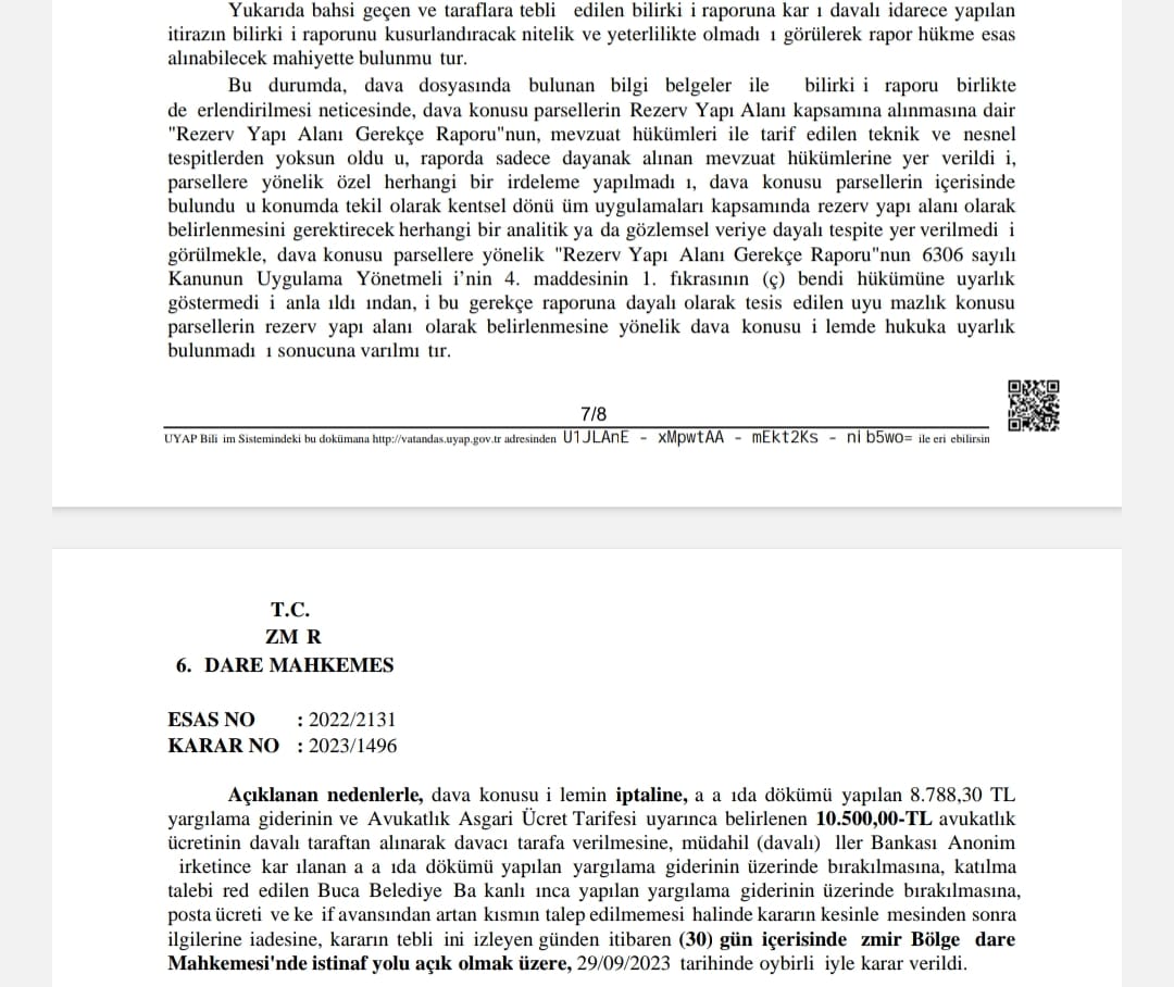 Murat Aydın'ın açıklaması şu şekilde:Buca cezaevi arazisi halkındır.İdare Mahkemesi, Buca cezaevi arazisinde rant planı yapmak isteyen Bakanlığın rezerv yapı alanı ilan eden kararını İPTAL ETTİ.Buca cezaevinin kapanmasından sonra, halka ait araziyi İzmir’in 100. Kurtuluş günü olan 9 Eylül 2022 tarihinde İller Bankası’na sattılar. Bu araziyi kamusal kullanıma açmak yerine binalarla doldurmak istediler. Çevre Bakanlığı yerle ilgili imar planı yapma yetkisine sahip olmak için hukuku yok sayarak alanı rezerv yapı alanı ilan etti. Daha sonra bu karara dayanarak arazinin %85'inde toplam 70 bin m2 inşaat yapılmasını sağlayan imar planı yaptı.İzmir halkı, İzmir halkının seçilmiş temsilcileri olan İzmir Büyükşehir Belediye Meclisi CHP'li meclis üyeleri olarak yapılan tüm bu işlemlerin hukuksuz olduğunu defalarca dile getirdik.Buca cezaevi arazisini rezerv yapı alanı ilan eden bakanlık kararının iptali için İzmir Büyükşehir Belediyesi tarafından açılan davaya bakan İzmir 6. İdare Mahkemesi, eski cezaevi alanının rezerv yapı alanı ilan edilmesine ilişkin bakanlık kararını iptal etti.Bakanlığın, arazide plan yapma yetkisine sahip olmak için yaptığı rezerv yapı alanı ilan kararı iptal edildiği için bu karara dayanarak imar planı yapma yetkisi dayanaksız kaldı.Mahkeme kararında, bizim daha önce defalarca dile getirdiğimiz haklı gerekçeleri teyit etti.Mahkeme gerekçesinde şu açıklama yer aldı: "Dava konusu parsellerin Rezerv Yapı Alanı kapsamına alınmasına dair 'Rezerv Yapı Alanı Gerekçe Raporu'nun, mevzuat hükümleri ile tarif edilen teknik ve nesnel tespitlerden yoksun olduğu, raporda sadece dayanak alınan mevzuat hükümlerine yer verildiği,parsellere yönelik özel herhangi bir irdeleme yapılmadığı, dava konusu parsellerin içerisinde bulunduğu konumda tekil olarak kentsel dönüşüm uygulamaları kapsamında rezerv yapı alanı olarak belirlenmesini gerektirecek herhangi bir analitik ya da gözlemsel veriye dayalı tespite yer verilmediği görülmekle, dava konusu parsellere yönelik 'Rezerv Yapı Alanı Gerekçe Raporunun' 6306 sayılı Kanunun Uygulama Yönetmeliği’nin 4. maddesinin 1. fıkrasının (ç) bendi hükümüne uygarlık göstermediği anlaşıldığından, işbu gerekçe raporuna dayalı olarak tesis edilen uyuşmazlık konusu parsellerin rezerv yapı alanı olarak belirlenmesine yönelik dava konusu işlemde hukuka uyarlıkbulunmadığı sonucuna varılmıştır."Özetle, Buca cezaevi arazisinin inşaata ve ranta açılması isteyen Çevre Şehircilik ve İklim Değişikliği Bakanlığı’nın rezerv yapı alanı ilan kararı iptal edilmiş oldu. Bu karar iptal edildiği için Bakanlığın, bu karara dayalı olarak yaptığı rant ve inşaat planı da hukuki olarak dayanıksız kaldı.Tüm zorluklara ve bilinen nedenlere rağmen hukuka olan inancımızı koruyarak, haksızlıklara karşı hak, hukuk ve adalet mücadelesini sürdürmeye devam edeceğiz.İzmir halkına "öteki" gözü ile bakanların, halkın kullanımı için ayrılması gereken kamusal arazilere el koymasına karşı mücadeleye devam edeceğiz.Buca cezaevi arazisi halkındır ve tümüyle yeşil alan olmalıdır.