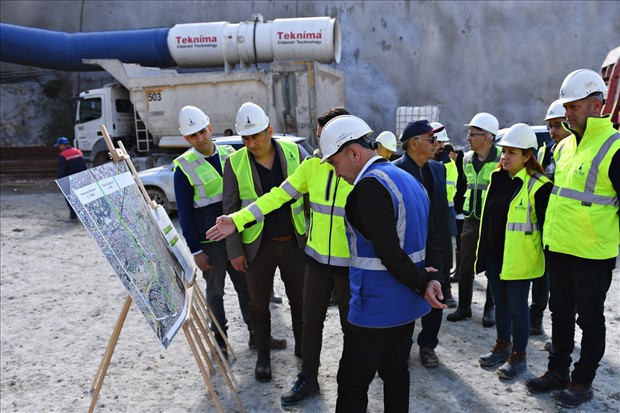 İzmir Büyükşehir Belediye Başkanı Tunç Soyer, Buca ile Bornova’yı kesintisiz birbirine bağlayacak Buca Onat Tüneli çalışmalarını yerinde inceledi. Başkan Soyer, tünelin sonuna kadar giderek kazı çalışmaları hakkında bilgi aldı. Başkan Soyer’e İzmir Büyükşehir Belediyesi Genel Sekreter Yardımcısı Özgür Ozan Yılmaz, Fen İşleri Dairesi Başkanı Hamdi Ziya Aydın ile yüklenici firma yetkilileri ve Büyükşehir Fen İşleri Dairesi çalışanları eşlik etti.