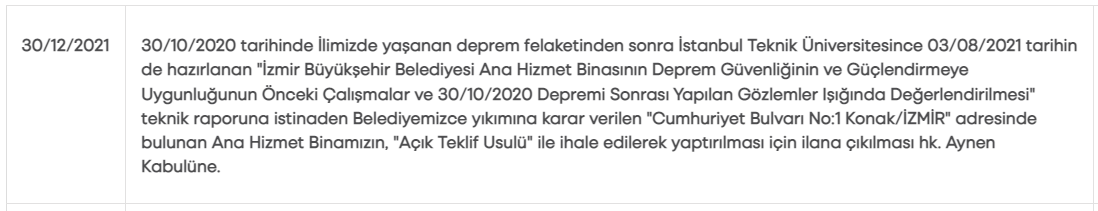 “30/10/2020 tarihinde İlimizde yaşanan deprem felaketinden sonra İstanbul Teknik Üniversitesince 03/08/2021 tarihin de hazırlanan "İzmir Büyükşehir Belediyesi Ana Hizmet Binasının Deprem Güvenliğinin ve Güçlendirmeye Uygunluğunun Önceki Çalışmalar ve 30/10/2020 Depremi Sonrası Yapılan Gözlemler Işığında Değerlendirilmesi" teknik raporuna istinaden Belediyemizce yıkımına karar verilen "Cumhuriyet Bulvarı No:1 Konak/İZMİR" adresinde bulunan Ana Hizmet Binamızın, "Açık Teklif Usulü" ile ihale edilerek yaptırılması için ilana çıkılması hk. Aynen Kabulüne”