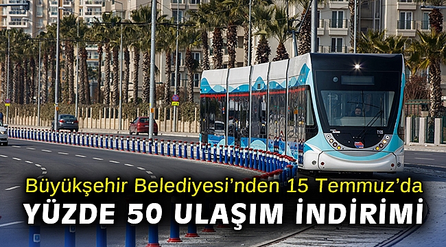 İzmir Büyükşehir Belediyesi 15 Temmuz programına katılacak yurttaşlar için 15 Temmuz 20.00 ile 16 Temmuz 06.00 saatleri arasında şehir içi toplu ulaşımda yüzde 50 indirimle hizmet verileceğini duyurdu.
