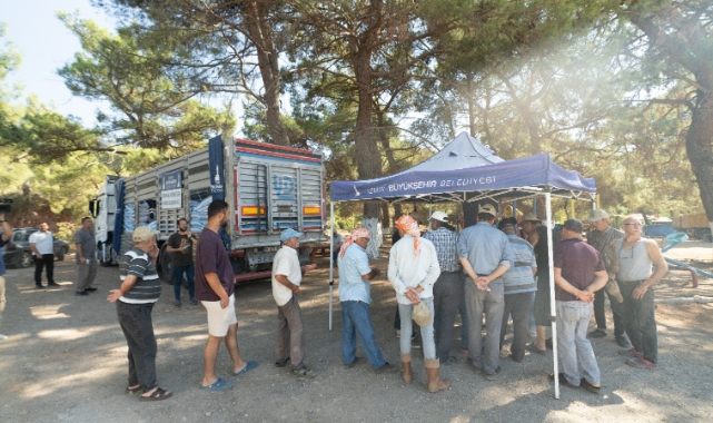 İzmir Büyükşehir Belediyesi haziran ve temmuz aylarındaki orman yangınlarından etkilenen üreticileri yalnız bırakmıyor. Yanan köylerde tarımsal üretimin devamlığı için su deposu desteğinin ardından Ödemiş, Seferihisar, Çeşme ve Aliağa’da 40 tonluk kesif yem dağıtımı yapıldı.