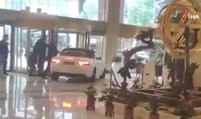 Çin'in Şanghay kentindeki bir otelde dizüstü bilgisayarı kaybolan müşteri, görevlilerle tartıştı. Daha sonra aracına binen müşteri, önce otelin döner kapısını kırdı, sonra lobiye daldı. İçeride aracıyla tur atan müşteri, arka kapıdan çıkmak istedi ancak başarılı olamadı. Bu sırada otel görevlileri aracın şoför kapısını açmaya çalıştı. Sürücü ise geri manevra yaparak yeniden ön kapıya yöneldi ve durmak zorunda kaldı.