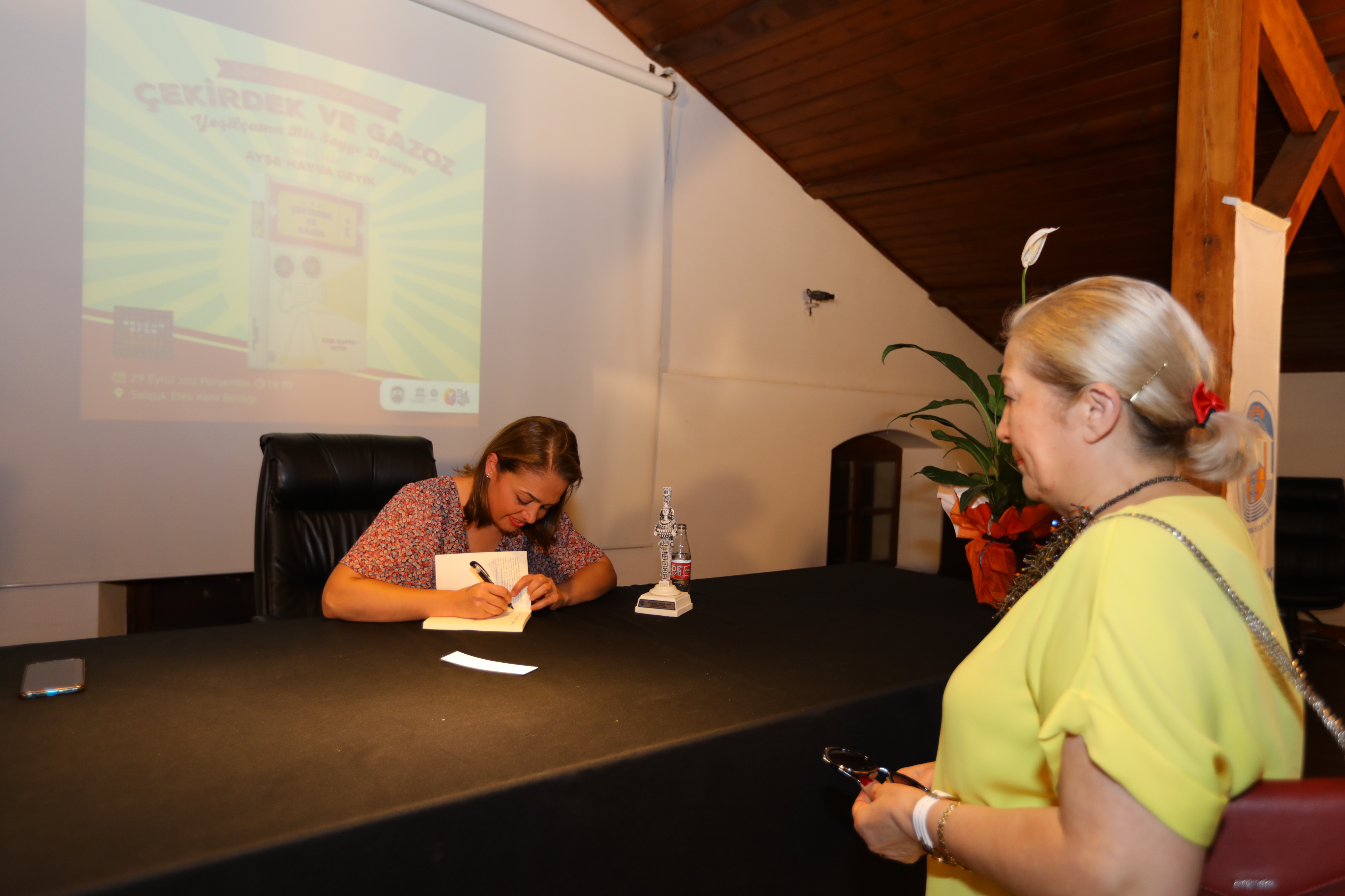 Selçuk Efes Kent Belleği bir kitap söyleşisine daha ev sahipliği yaptı. Yeşilçam’a saygı duruşu olarak nitelendirdiği Çekirdek ve Gazoz adlı kitabının imza gününde konuşan Ayşe Havva Geyik; “Uzun yıllar geniş halk kitleleri tarafından izlenen ve izlenecek olan Yeşilçam filmleri bir saygı duruşunu hak ediyor. Ben bu saygı duruşu adına Çekirdek ve Gazoz’u yazdım” dedi.Toplumsal belleğimizde yer edinen birçok filmin Yeşilçam’a emek veren isimler tarafından zor şartlar altında çekildiğinin altını çizen Ayşe Havva Geyik; “Yeşilçam’da anlatılan aslında bu toprakların, bizlerin, hepimizin hikâyesidir. Yeşilçam’ın bir tılsımı var. Ben bu kitapta biraz da bu tılsımı anlattım. Bunu yaparken de akıp giden zamanda değişen hayatımıza, sosyo-ekonomik dengeleri, insan ilişkilerini, aileyi, aşkı ve Türkiye’nin yakın tarihini anlatmaya çalıştım” dedi.
