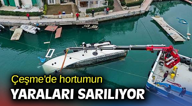 İlçede 10 Şubat'ta etkili olan hortumda Alaçatı Port'ta demirliyken yan yatan ve ardından suya gömülen 15 metrelik yatın kurtarılması için hassas bir çalışma yürütüldü.