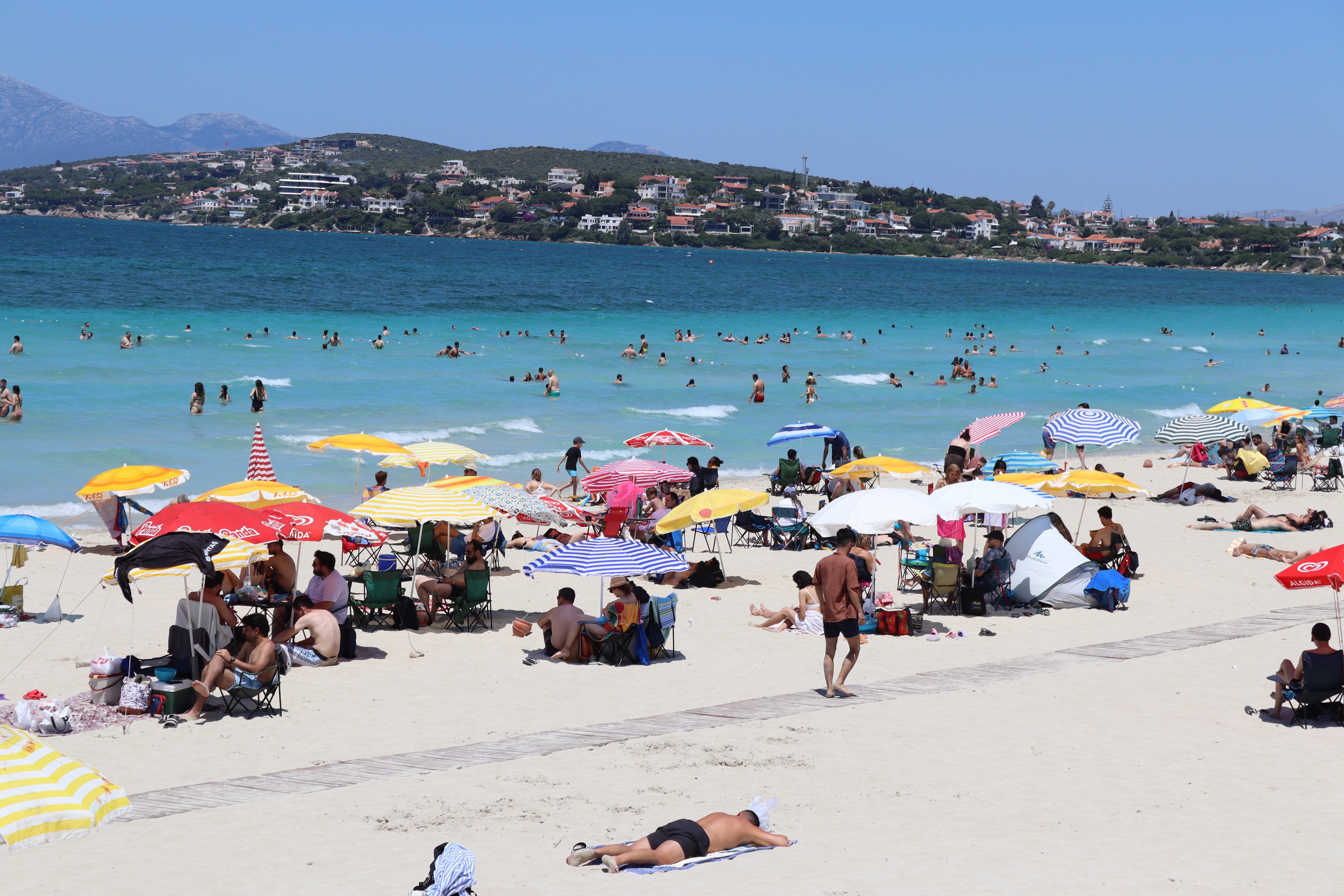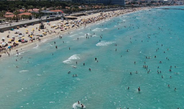 İzmir’in en ünlü ve gözde tatil noktalarından biri olan Çeşme’de bayram yoğunluğu yaşanıyor. Arefe gününden itibaren ilçeye gelmeye başlayan tatilciler, bölgedeki otelleri yüzde 90 oranında doldurdu. Yerleşik nüfusu yaklaşık 50 bin olan Çeşme’nin nüfusu bayramın birinci gününden 1 milyonu geçti. Çeşme’nin en ünlü plajlarından biri olan Ilıca plajında da yaşanan nüfus yoğunluğu göze çarptı. 3 kilometrelik şeridi olan ünlü plaja gelen vatandaşlar, kumsalları hıncahınç doldurdu. Rüzgarın da zaman zaman şiddetini artırdığı plajda bazı vatandaşlar yüzerek vakit geçirirken, bazıları da güneşlenmeyi tercih etti. Ilıca plajında oluşan kalabalık havadan görüntülendi.